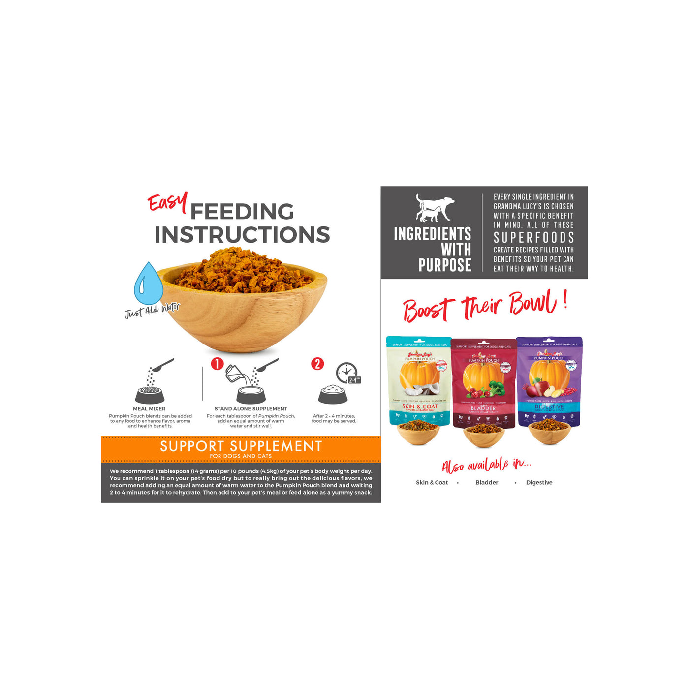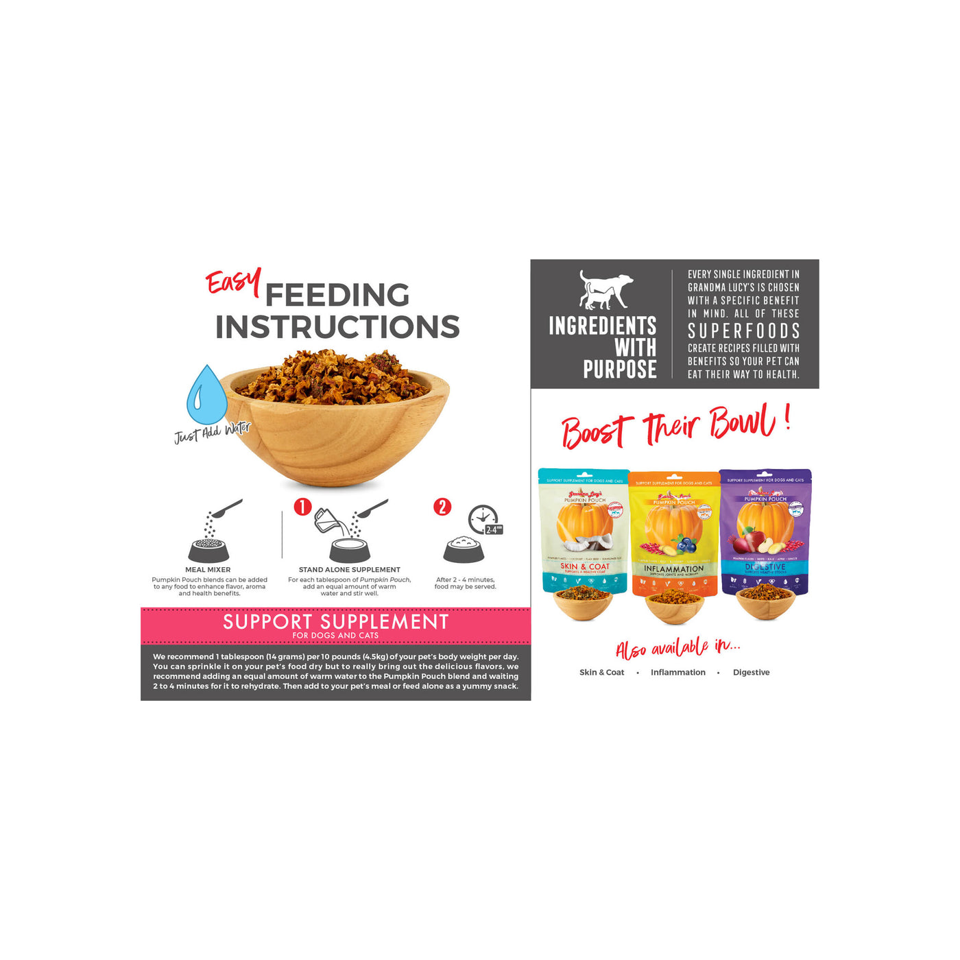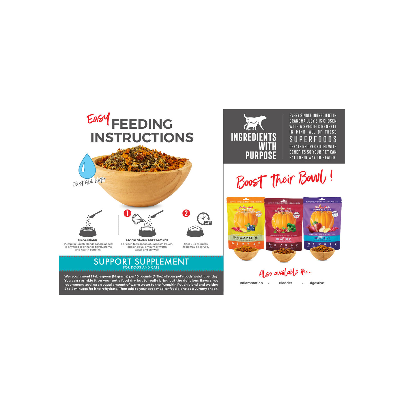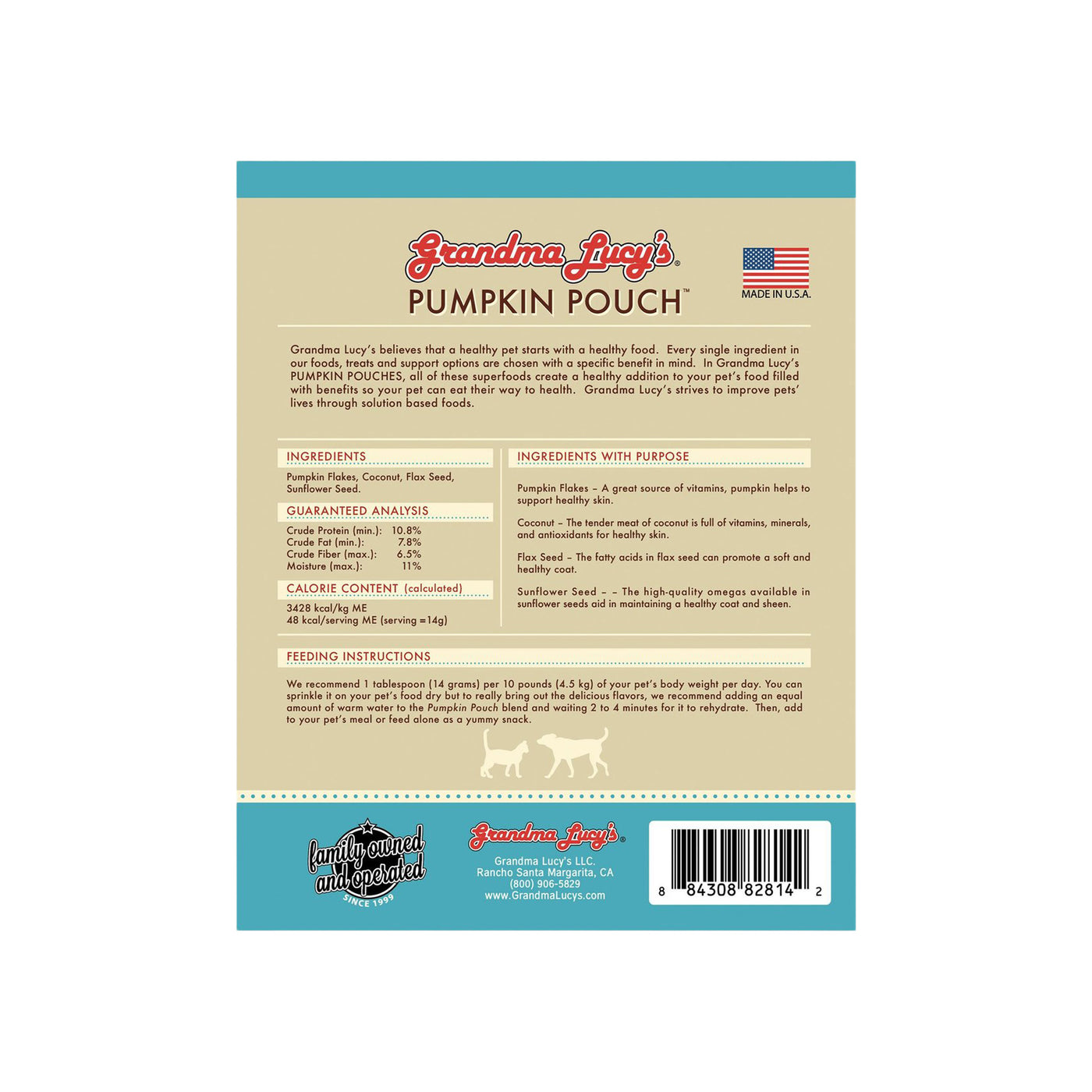 Grandma Lucy's Supplement for Dogs & Cats provides your pet with an extra boost of nutrition for their overall health and well-being. With a focus on thoughtful ingredient selection, each component is chosen with a specific benefit in mind, ensuring optimal nutrition. The Pumpkin Pouches contain a blend of superfoods, offering a nutritious addition to your pet's diet. Whether added to their food or mixed with water for a treat, Pumpkin Pouches offer versatility in usage. Packed with benefits, they allow your pet to eat their way to health, supporting their vitality and overall wellness.