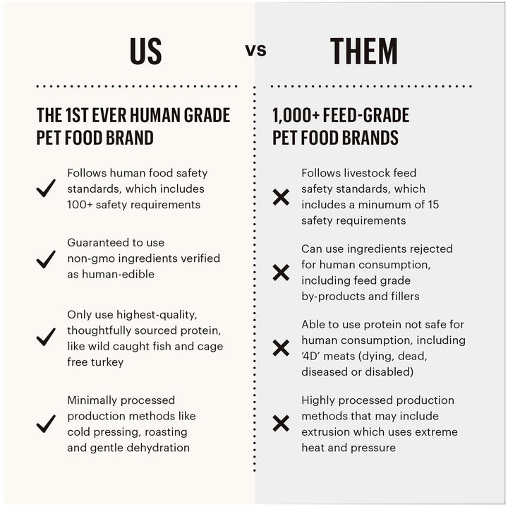 Unlike most pet foods that are "feed grade," The Honest Kitchen's human grade foods meet higher standards of safety and nutrition.