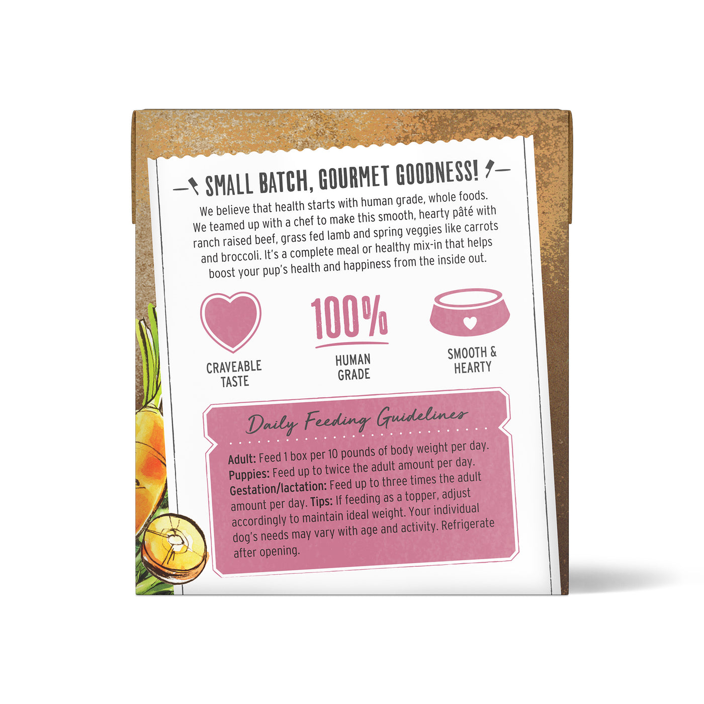 This hearty pate is kettle-cooked in small batches of bone broth. - Free of artificial flavors or preservatives, GMOs, gums, carrageenan, feed-grade ingredients, meat meals or fillers.