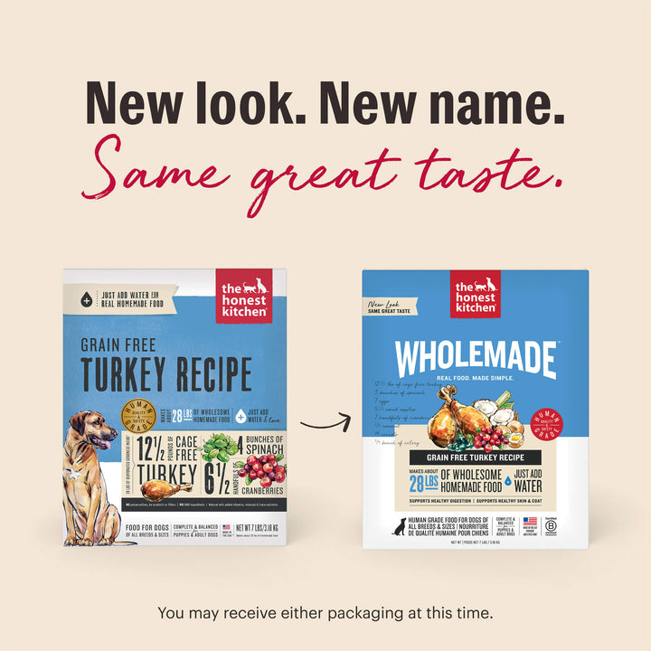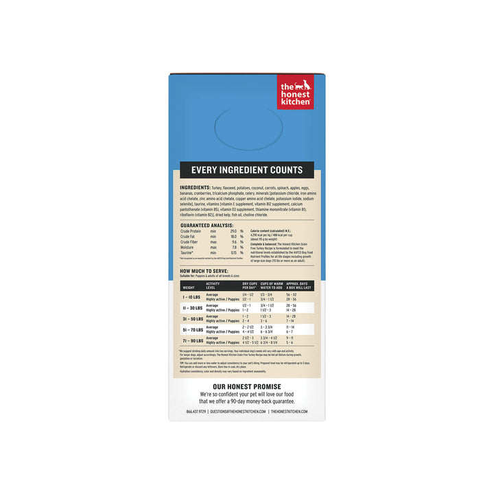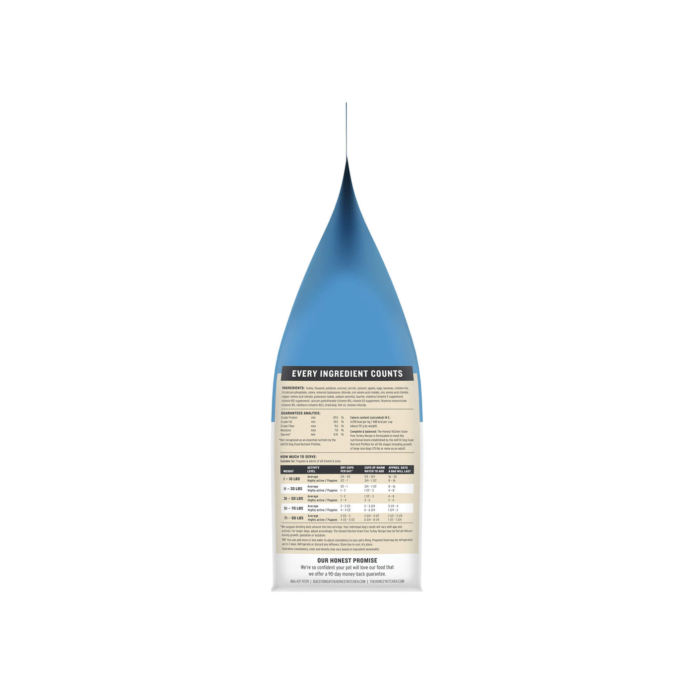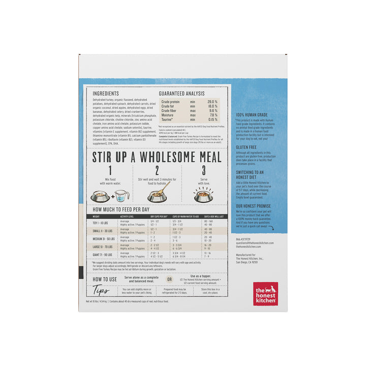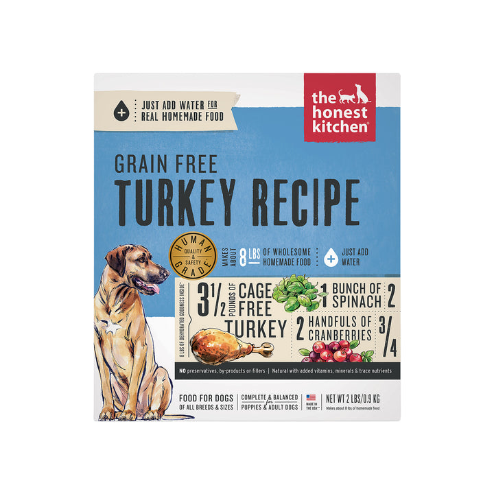 The Honest Kitchen makes wholesome, natural food, like the Grain Free Turkey Recipe, for dogs using gentle dehydration, a unique new approach to canine nutrition. These foods help you create delicious and nutritious meals made with real, recognizable, and human-grade ingredients that are ready to prepare and serve at home. Simply add warm water to rehydrate, and you have a complete meal with USDA meat, fresh fruits and vegetables, organic flaxseed, herbs, vitamins, minerals.