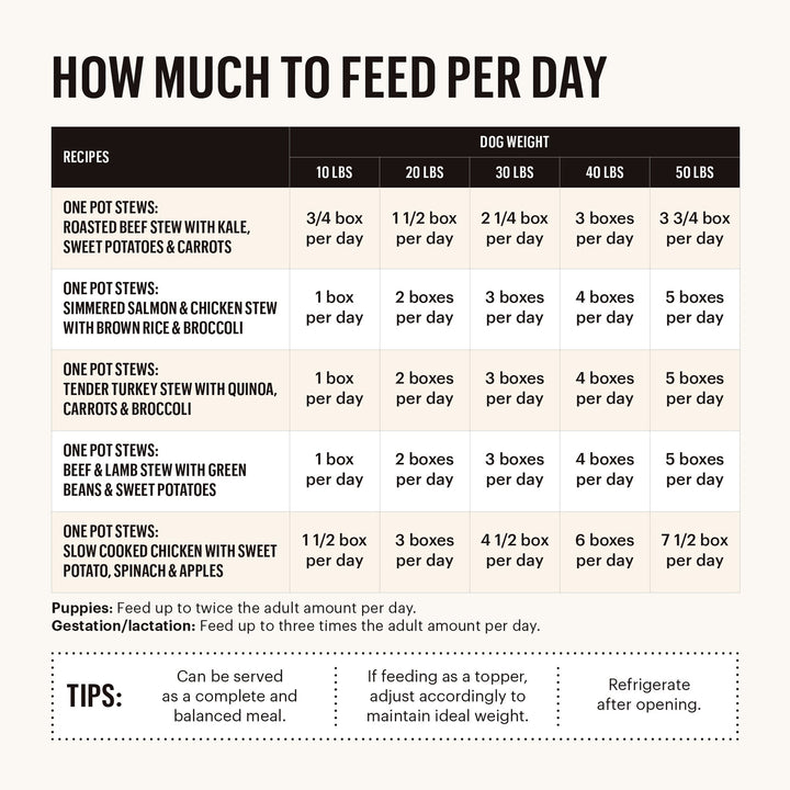 Tips: If feeding as a topper, adjust accordingly to maintain ideal weight. Your individual dog's needs may vary with age and activity. Refrigerate after opening.