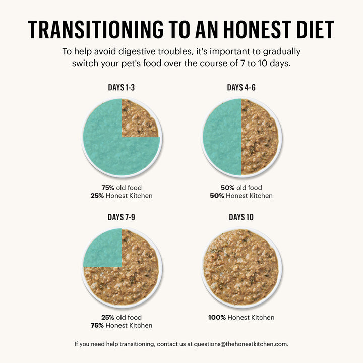 If your dog has never tried our foods before, we recommend starting out slowly. Over a period of 1 to 2 weeks or so, start by adding just a small amount of the Honest Kitchen (with water added) into your dogs current meals. Gradually increase the amount of the Honest Kitchen while decreasing the amount of your dogs original diet.