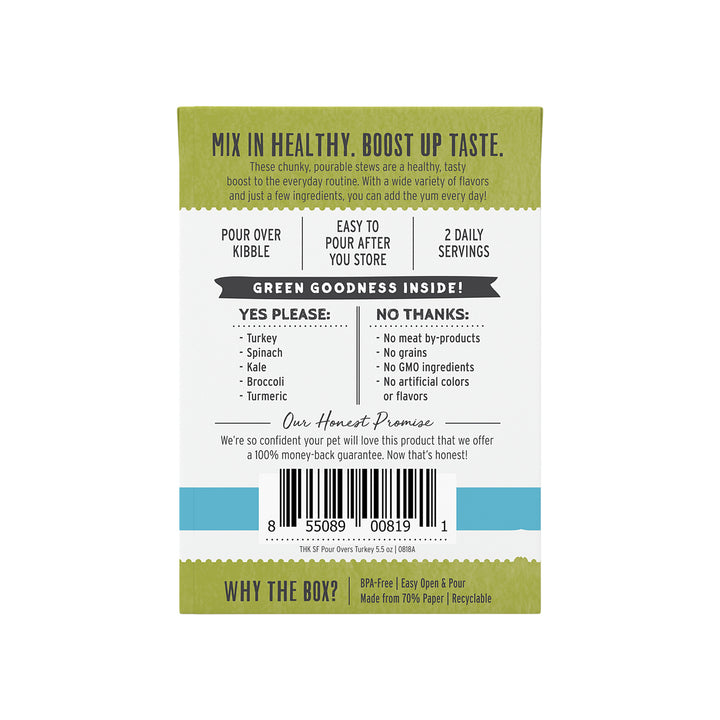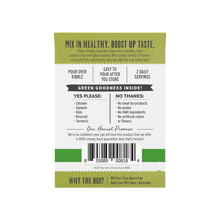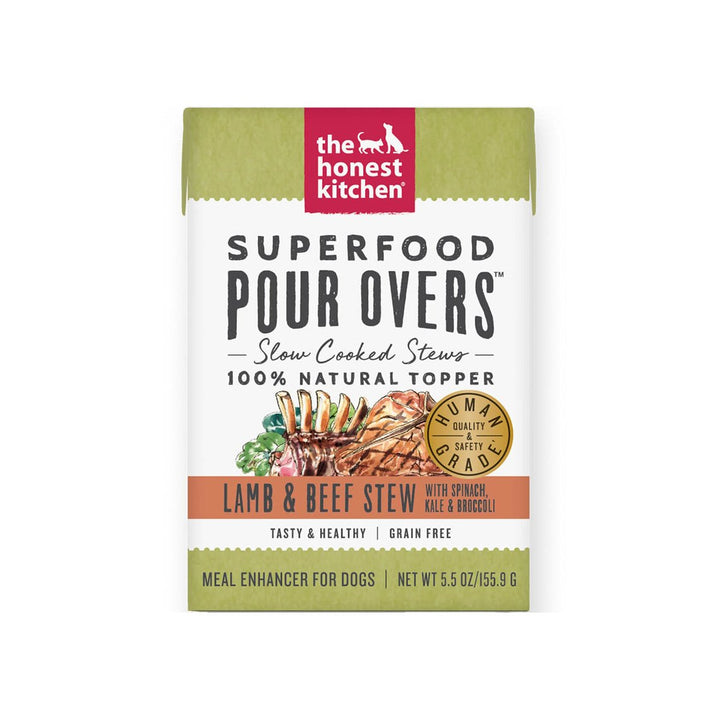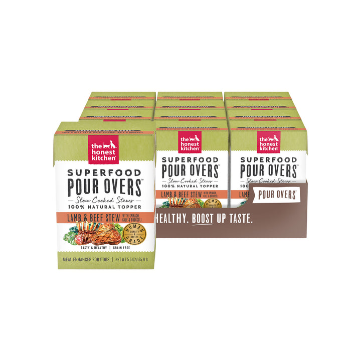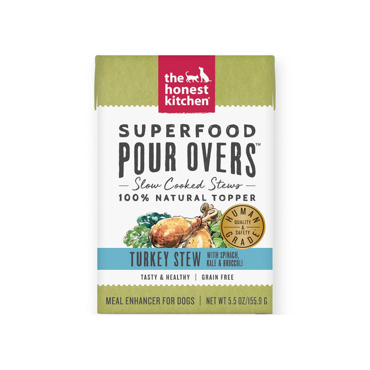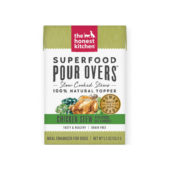The Honest Kitchen Superfood Pour Overs are a highly nutritious and tasty foods utilize vitamin and mineral packed power greens such as spinach, kale and broccoli. Added turmeric has natural anti-inflammatory properties while bone broth supports their immune system, protects joints and aids in a healthy gut. Plus, it tastes great, so even picky eaters will be chowing down. The Honest Kitchen Superfood Pour Overs will add important vitamins and minerals to your dog?' regular kibble and give your dog a variety of flavors to choose from and enjoy.