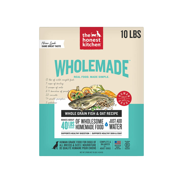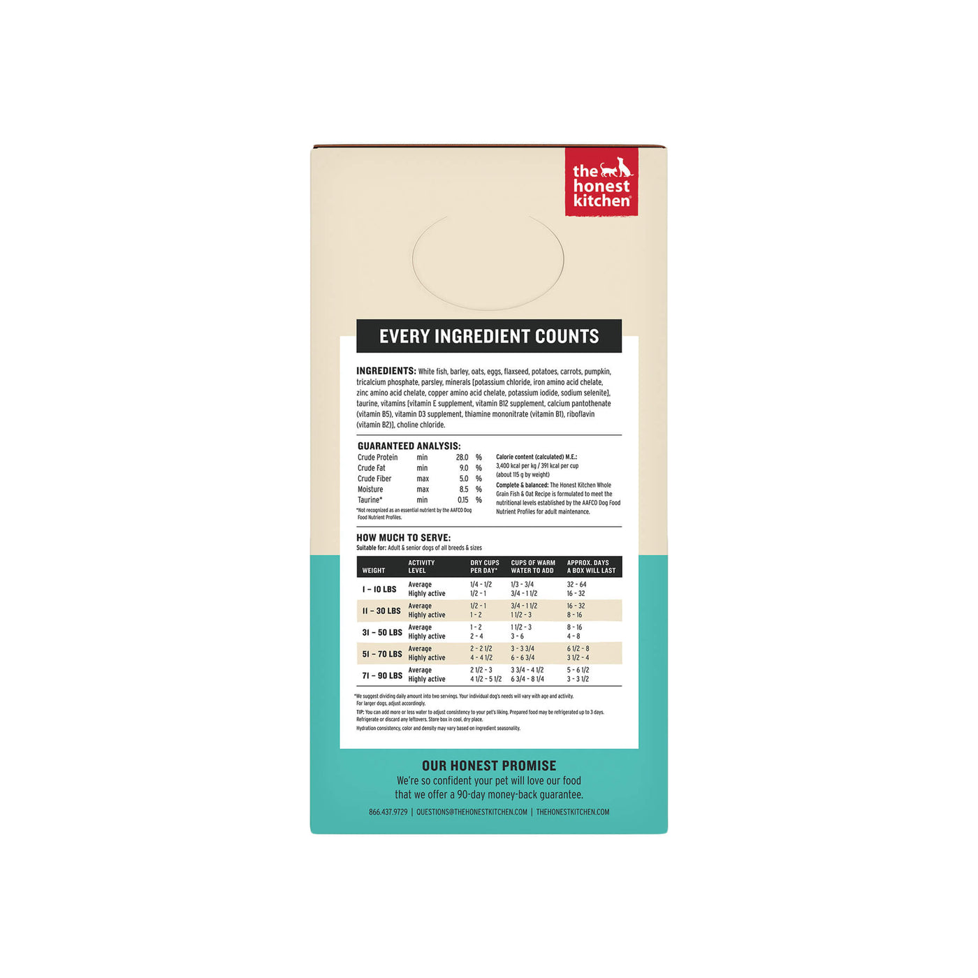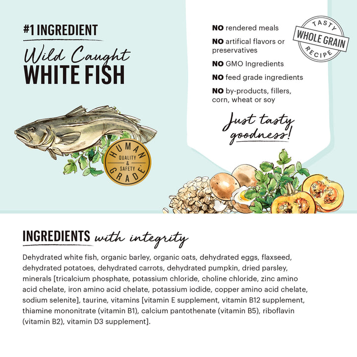 The Honest Kitchen Whole Grain Dehydrated Dog Food has no antibiotics, hormones, GMO ingredients, corn, soy, rice, beet pulp, or wheat… you can rest assured there’s absolutely nothing fishy about this fish. In fact, this whole grain dish that’s perfect for adult dogs features wild-caught, Marine Stewardship Council Certified white fish plus hearty oats—all dehydrated for prime nutrient retention and superior bio-availability and digestibility. Even dogs with the most sensitive of tummies will fall for this easy-to-digest food. And we're not fishing for compliments, but our Whole Grain Fish & Oat Recipe is 100% human grade—as always. *Substantiated by In-Home AAFCO Feeding Trial.
