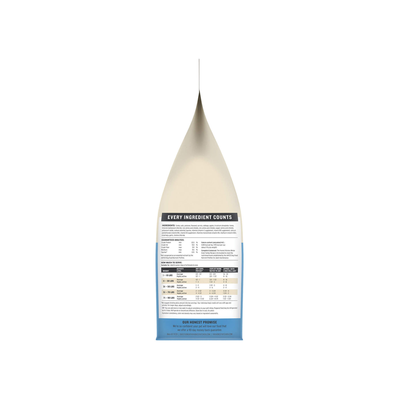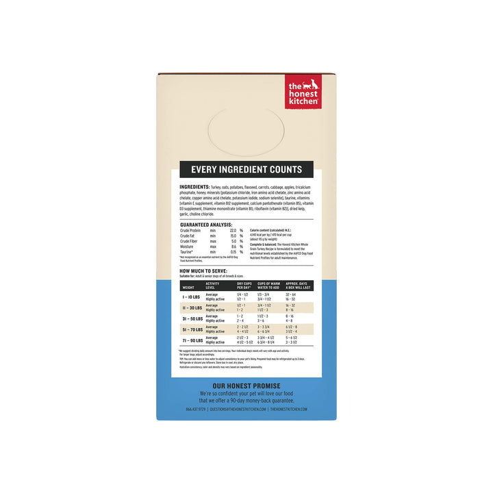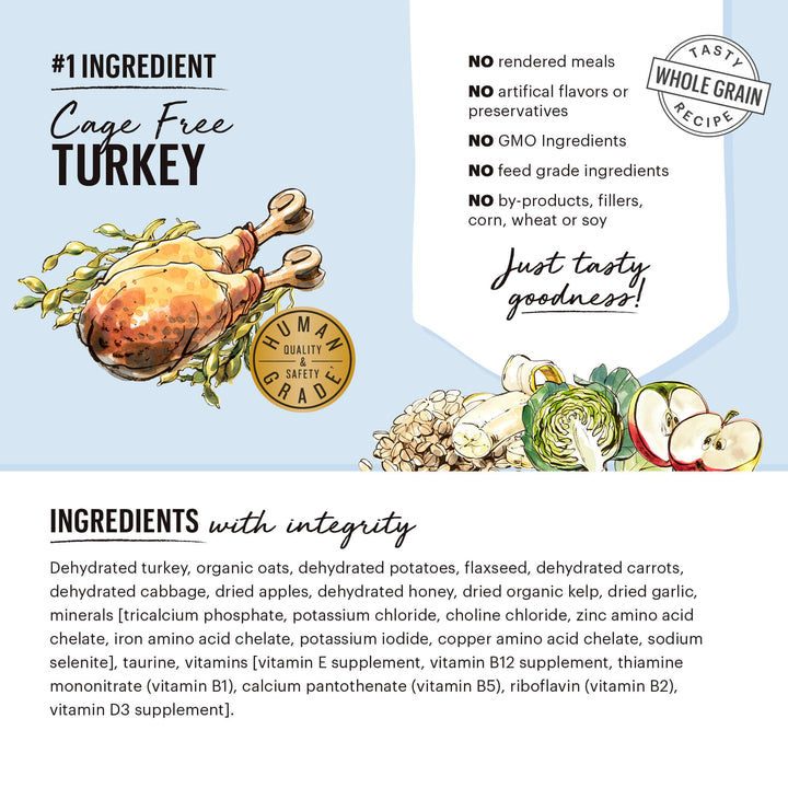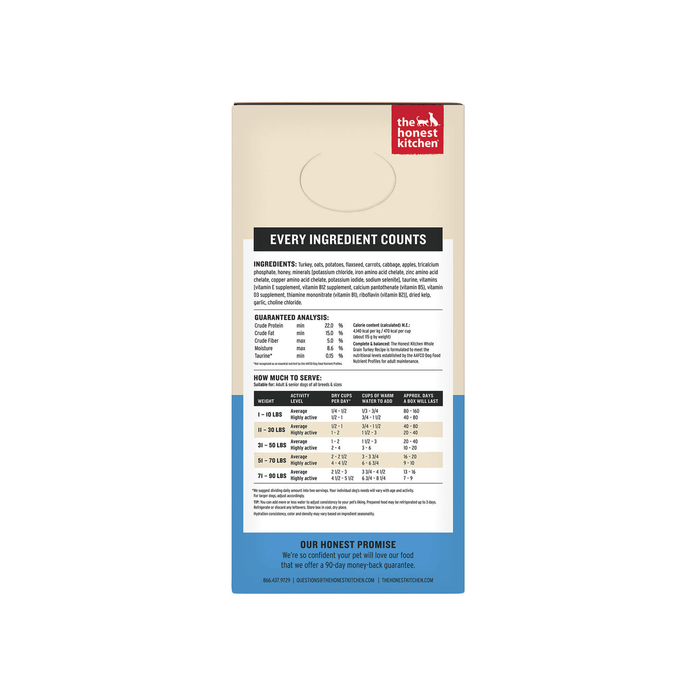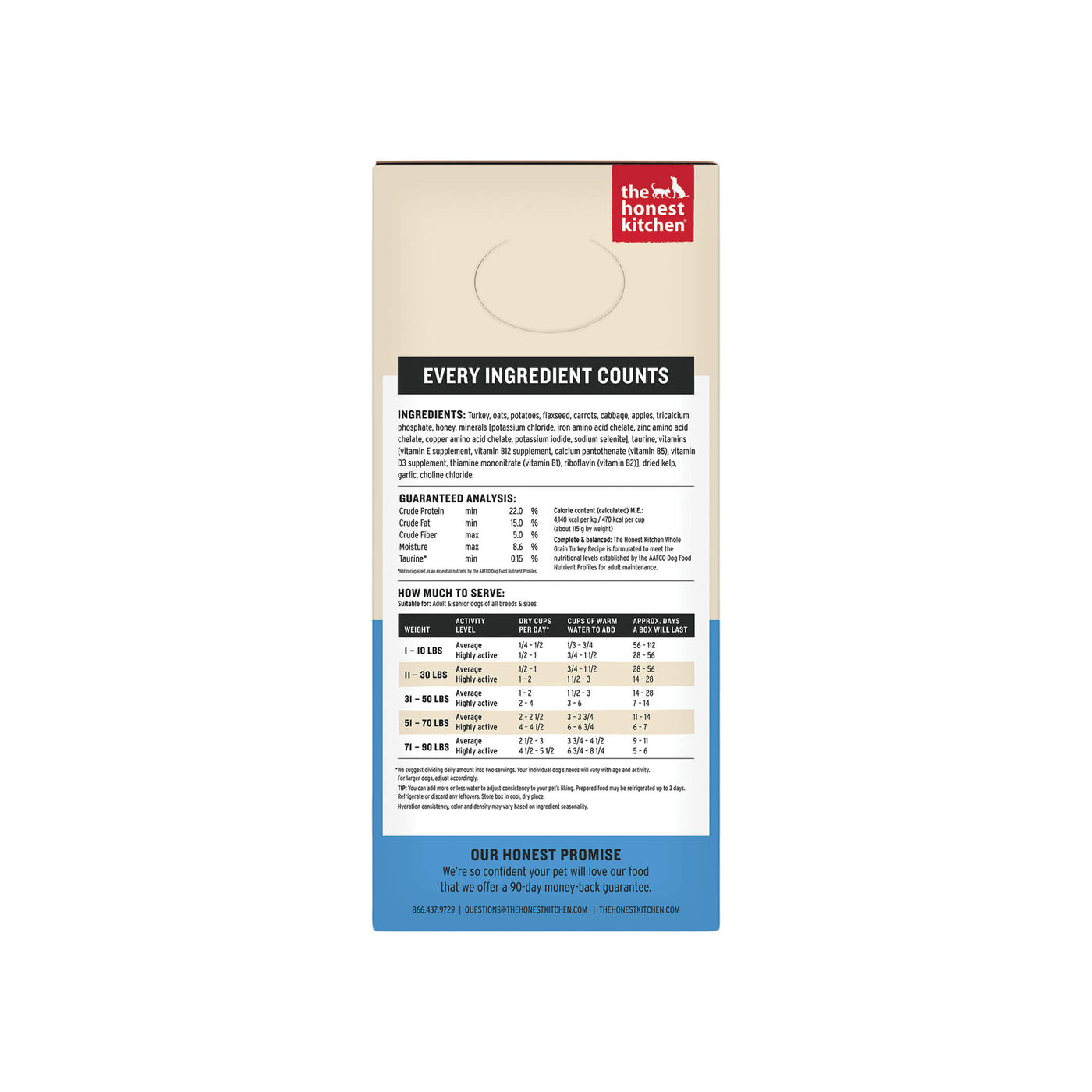 Honest Kitchen Whole Grain Turkey Recipe Dehydrated Dog Food uses wholesome, natural food for dogs using gentle dehydration, a unique new approach to canine nutrition. These foods help you create delicious and nutritious meals made with real, recognizable, and human-grade ingredients that are ready to prepare and serve at home. Simply add warm water to rehydrate, and you have a complete meal with USDA meat, fresh fruits and vegetables, organic flaxseed, herbs, vitamins, minerals, and organic grains.