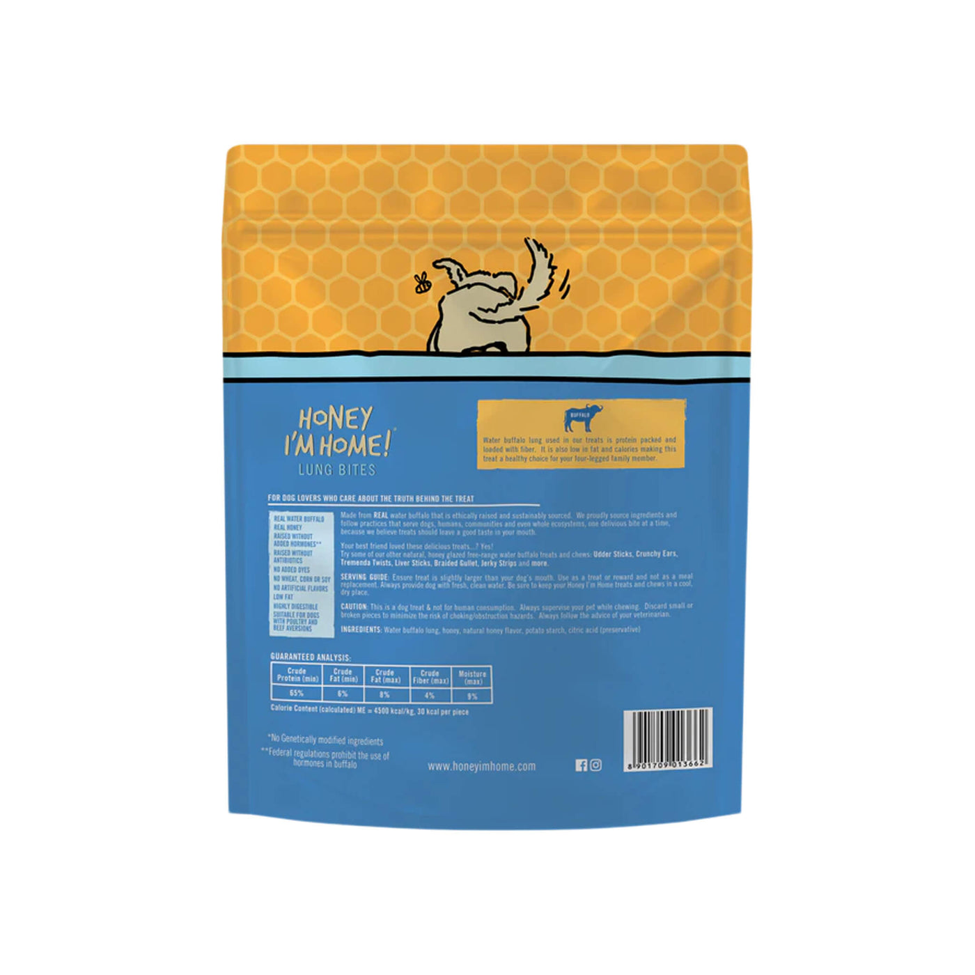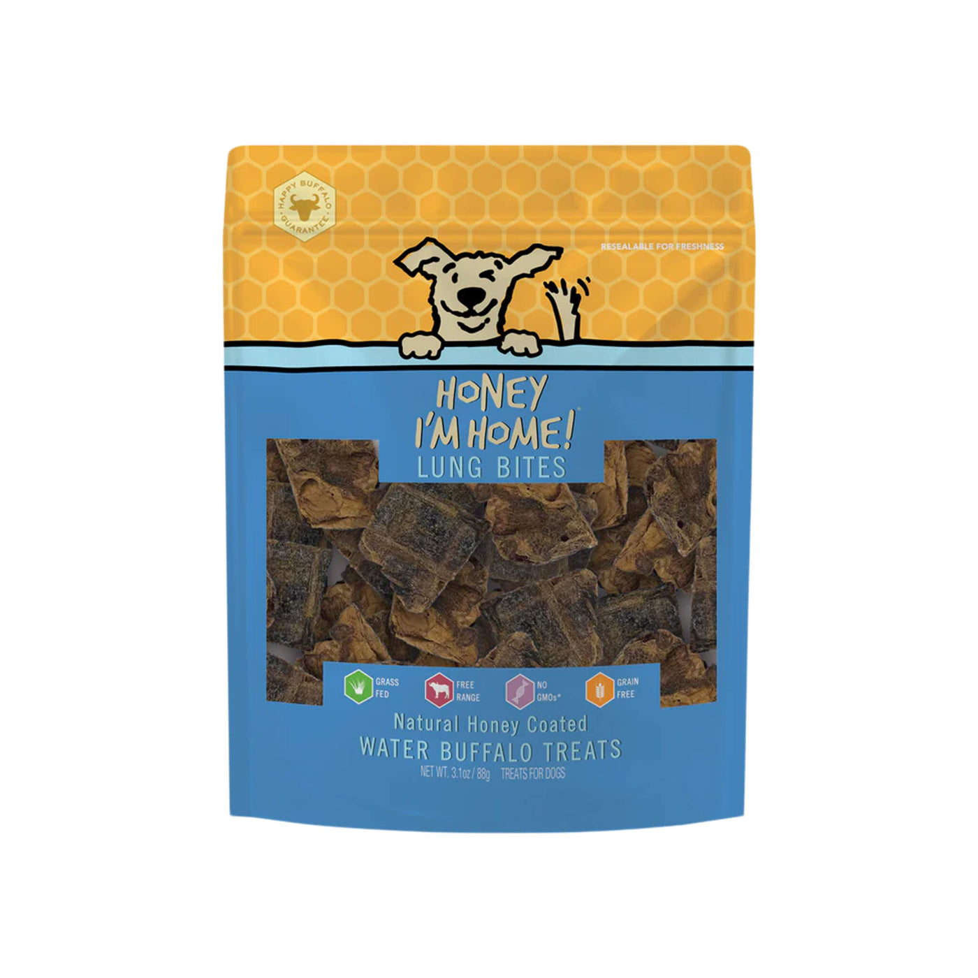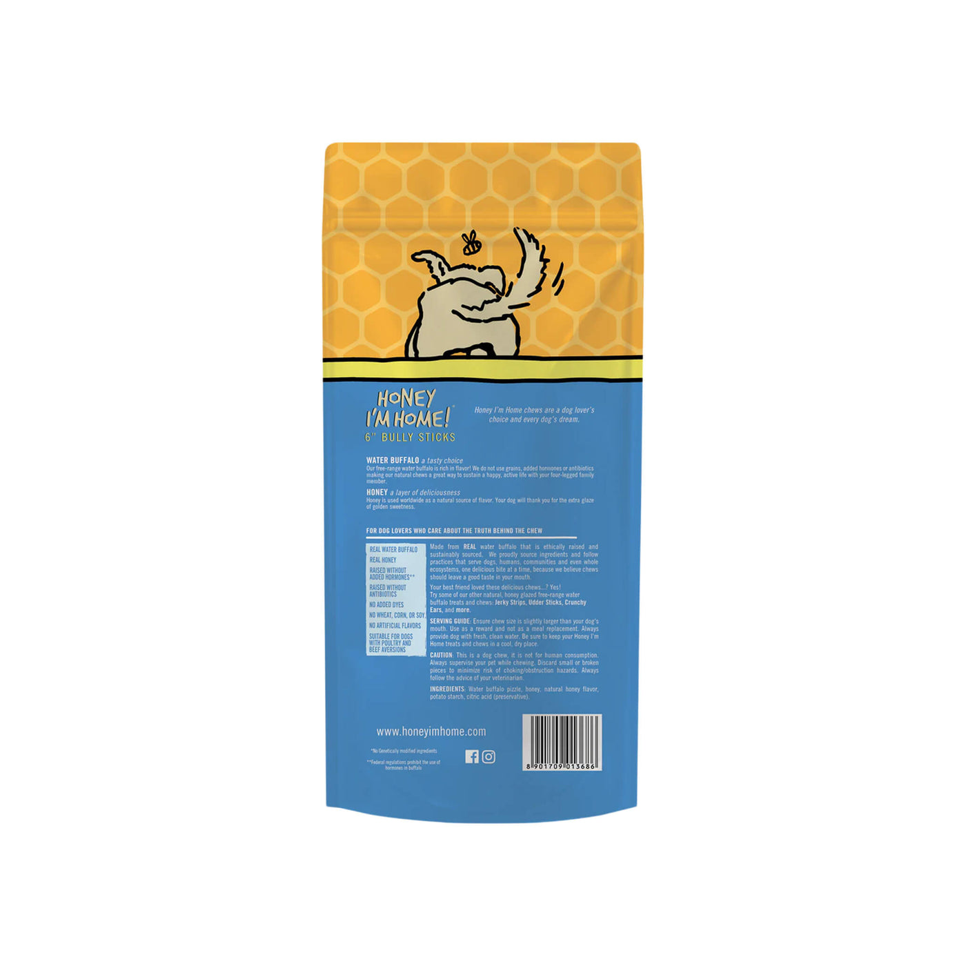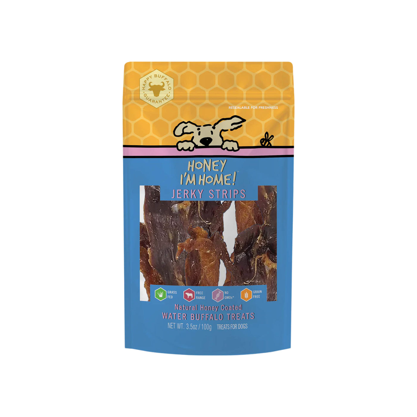 Honey I'm Home Dog Treats are crafted from ethically sourced water buffalo and coated in a light glaze of honey for irresistible taste. These honey coated water buffalo dog treats offer a satisfying crunch with natural protein and long-lasting chew time.