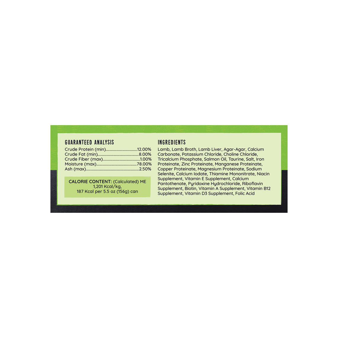 Lamb, Lamb Broth, Lamb Liver, Agar-Agar, Tricalcium Phosphate, Choline Chloride, Potassium Chloride, Magnesium Oxide, Minerals (Zinc Proteinate, Iron Proteinate, Manganese Proteinate, Copper Proteinate, Sodium Selenite, Calcium Iodate), Salt, Vitamins (Thiamine Mononitrate Supplement, Vitamin E Supplement, Niacin Supplement, Vitamin A Supplement, Calcium Pantothenate, Pyridoxine Hydrochloride, Riboflavin Supplement, Biotin, Vitamin B12 Supplement, Folic Acid, Vitamin D3 Supplement), Taurine, Salmon Oil