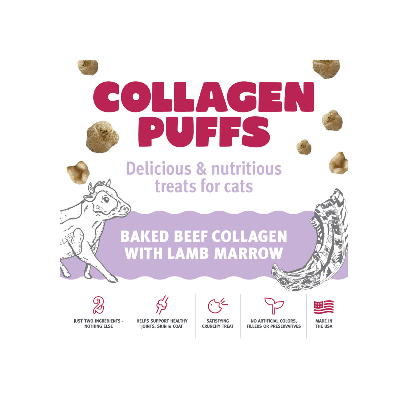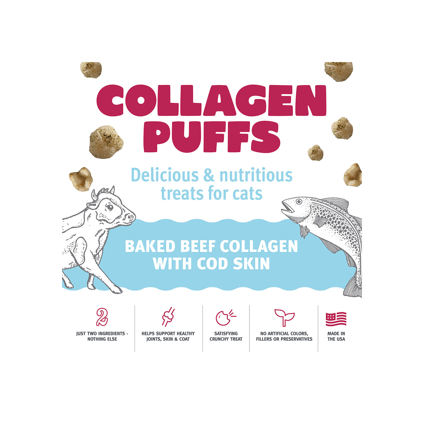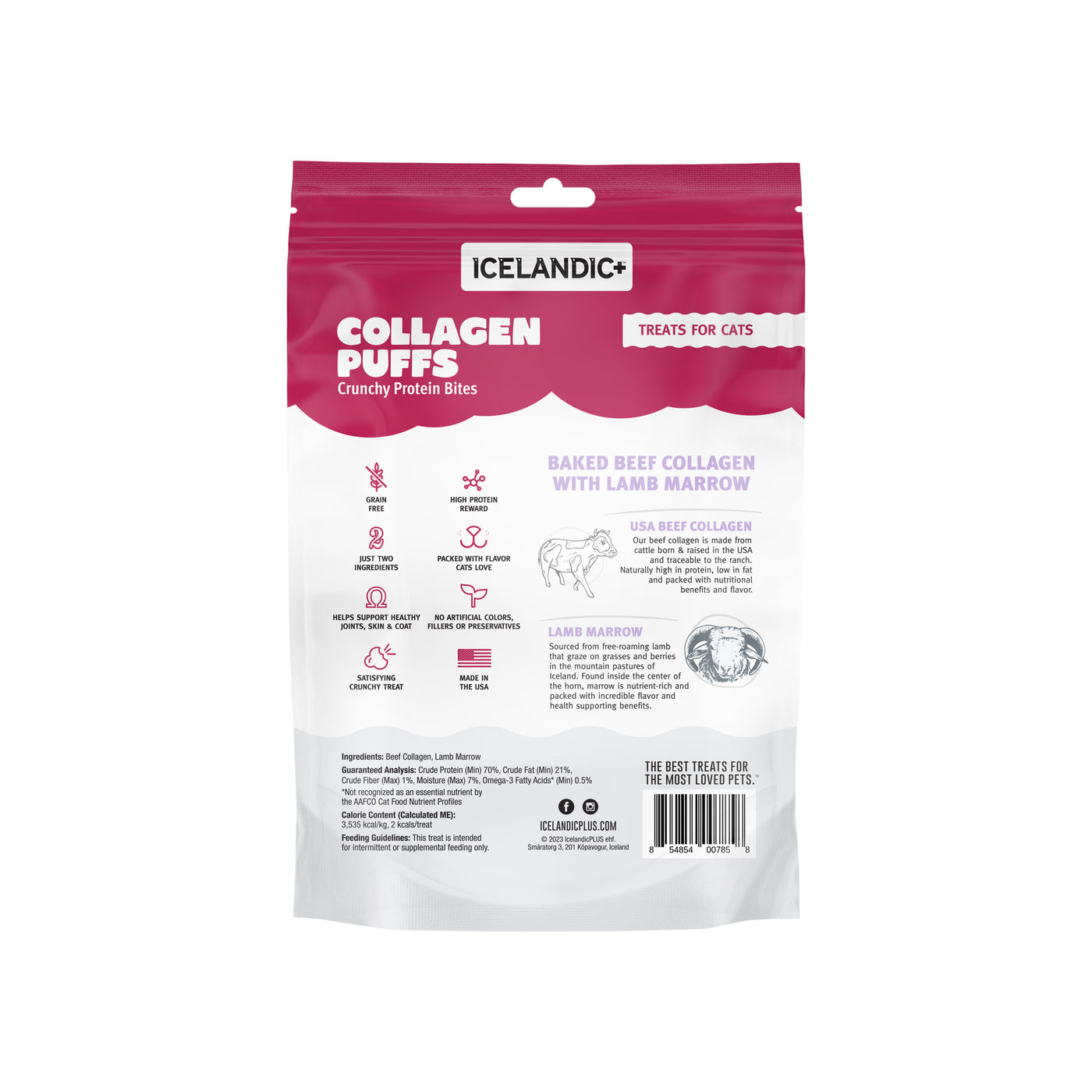 Treat your furry bestie to a nutritious and delicious snack with Icelandic+ Beef Collagen Mini Puffs for Cats. Made with just two wholesome ingredients and available in two different flavors. USA-raised beef collagen and either the skin of wild-caught cod or high quality lamb marrow.