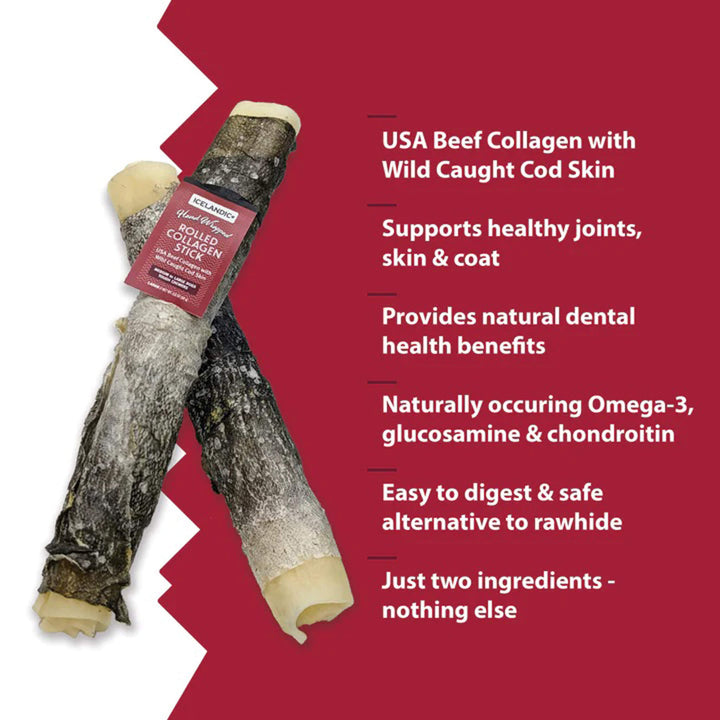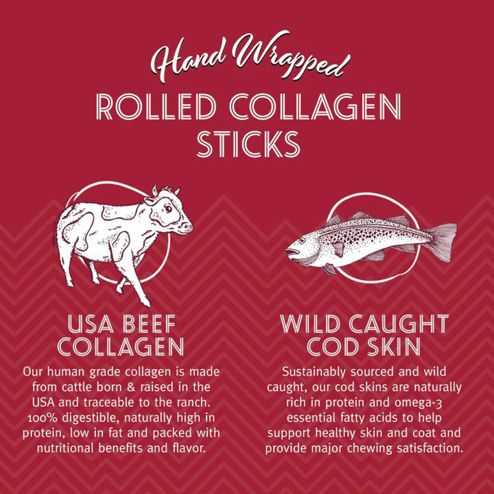 Icelandic+ Beef Rolled Collagen Stick Dog Chew with Wrapped Fish are sure to entertain even the pickiest of dogs. Each chew is made from all-natural beef raised in the USA and hand-wrapped with an extra tasty wild-caught Atlantic cod skin for the best 2-in-1 chew. With just two healthy ingredients, these delicious dog treats are completely free of chemicals, additives, and artificial anything.