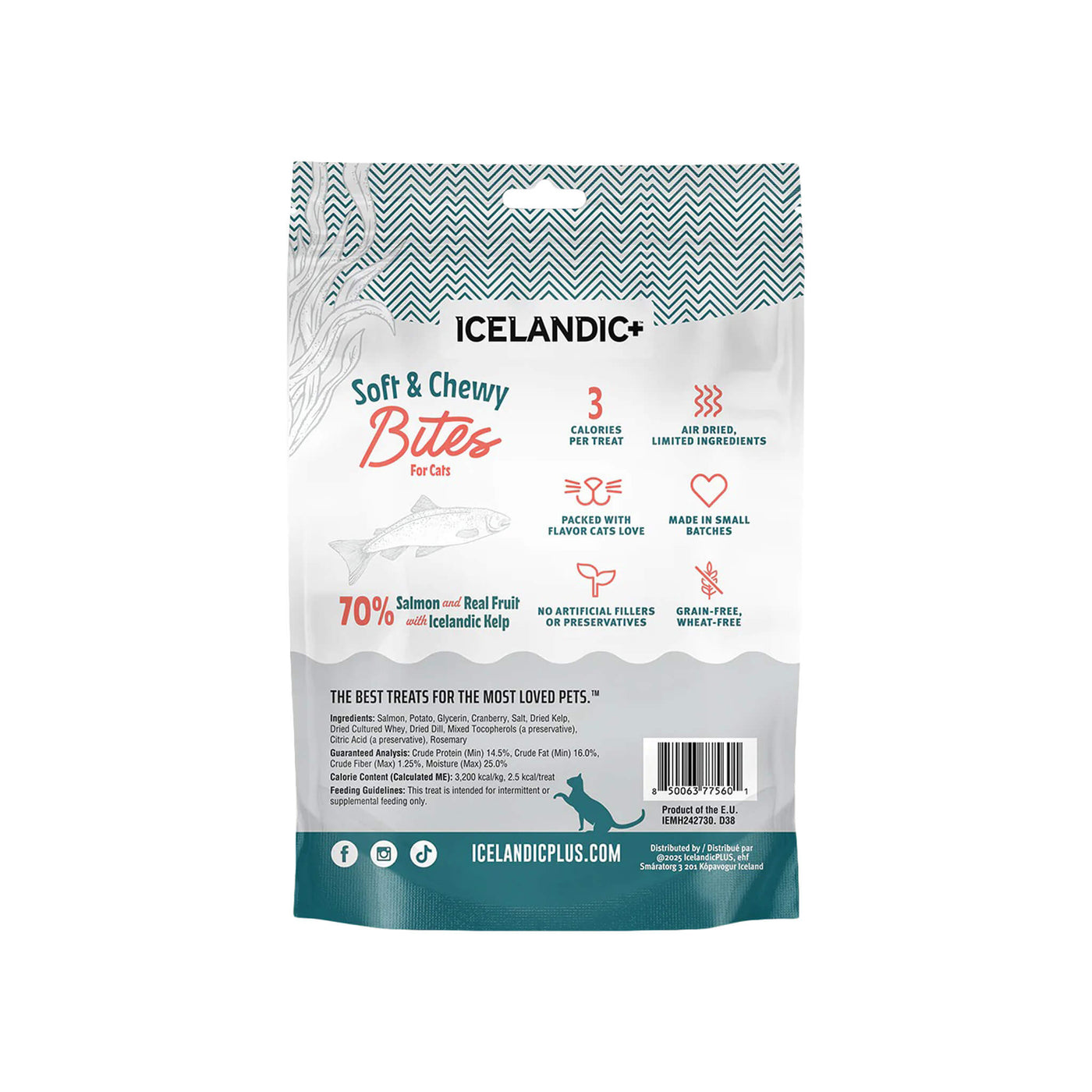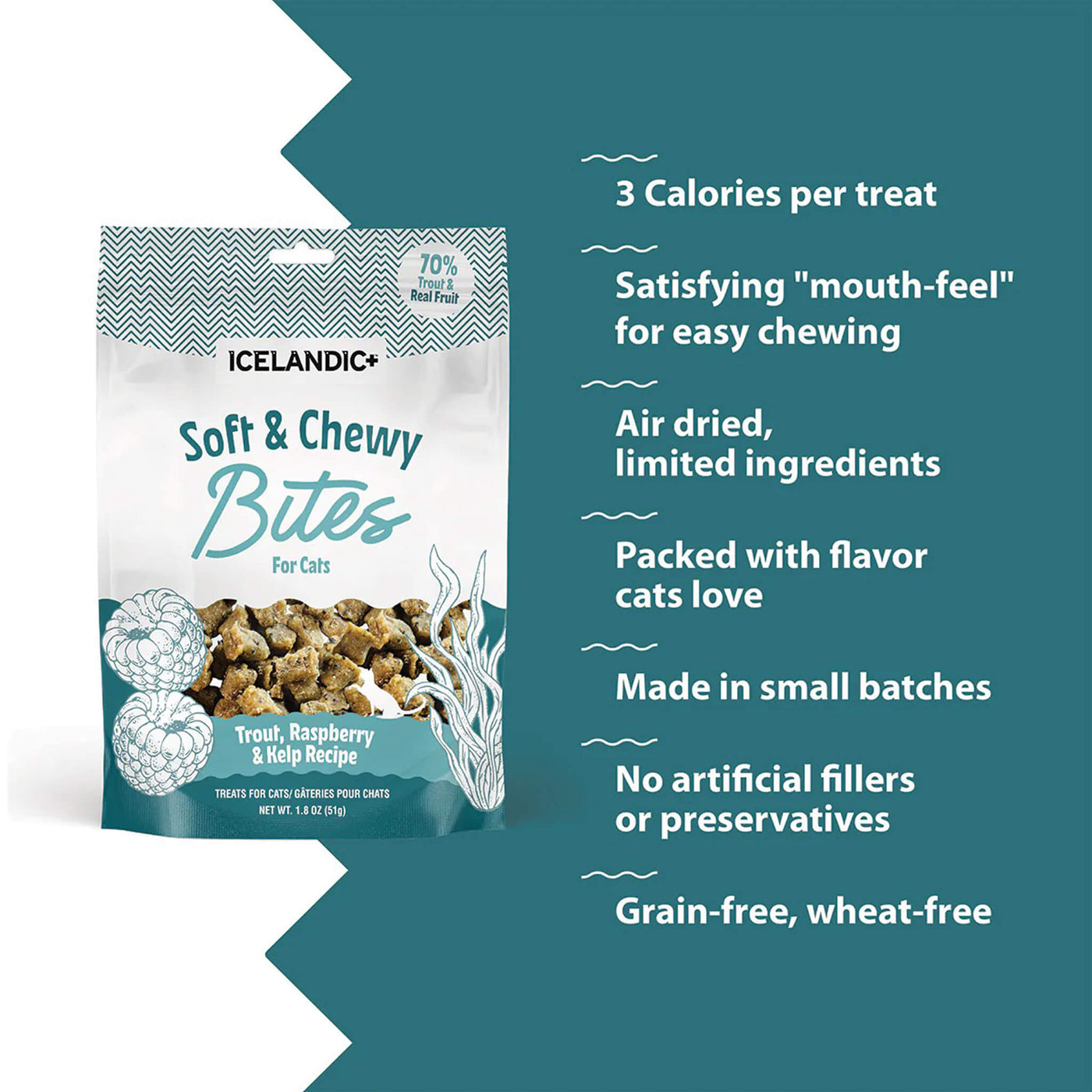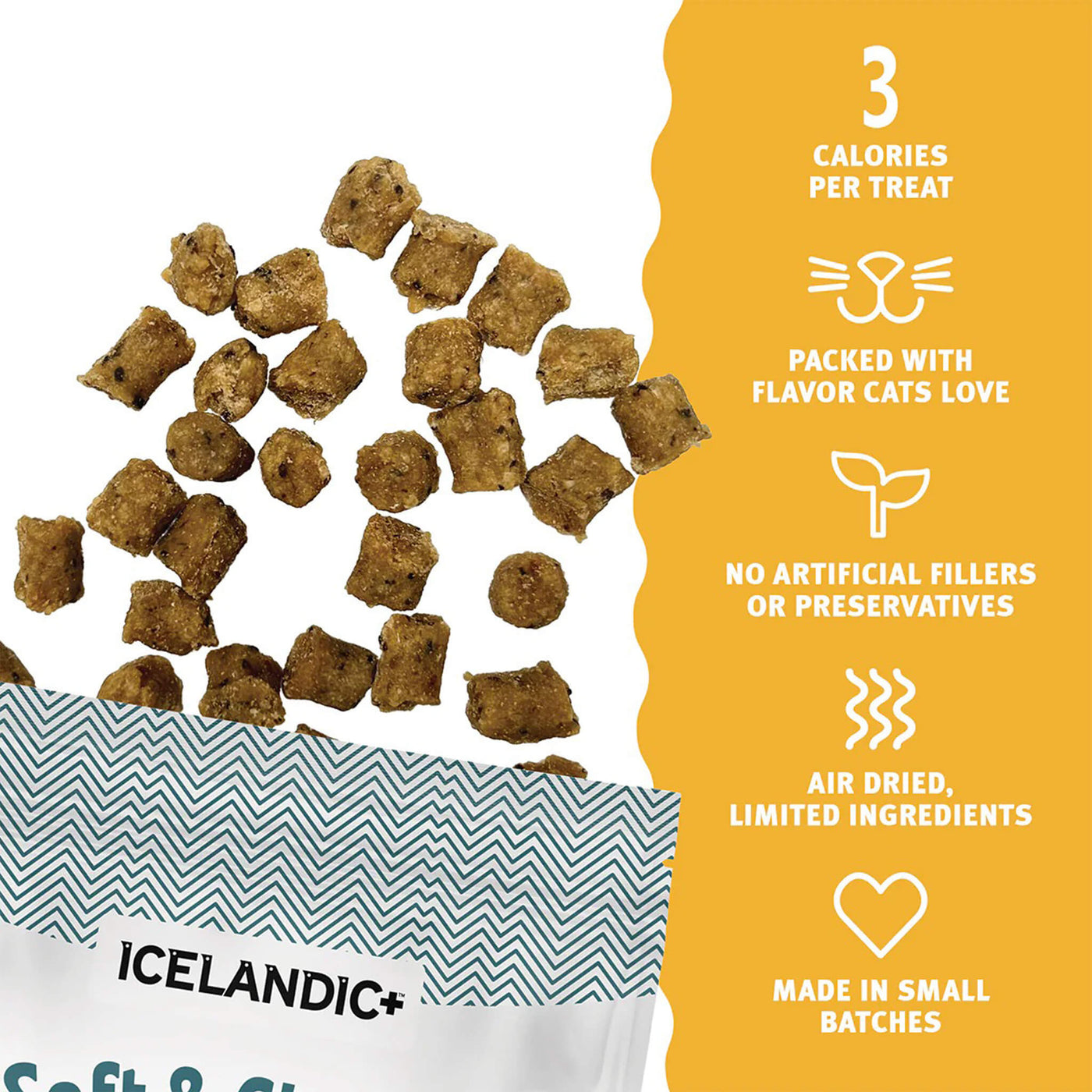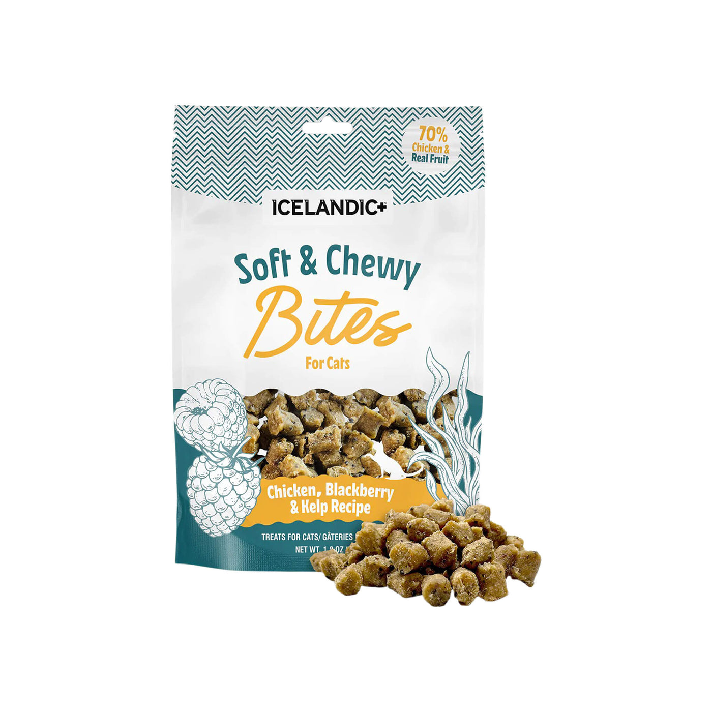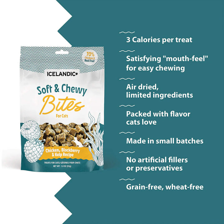 Icelandic+ Soft & Chewy Bites for Cats are tender, bite-sized rewards made with real animal protein and the addition of kelp. These chewy treats with kelp for cats offer a soft texture that’s easy to portion for training or daily treating.