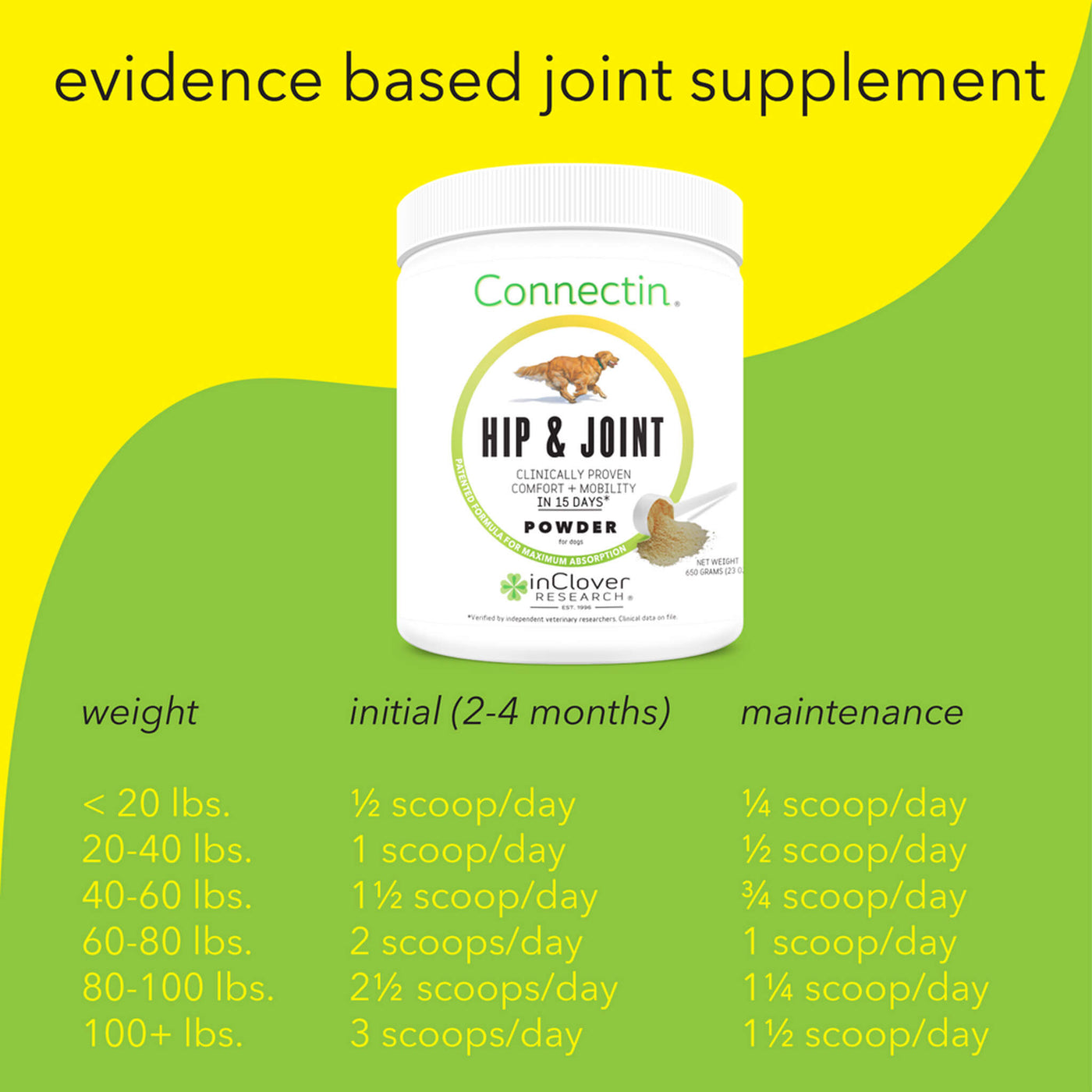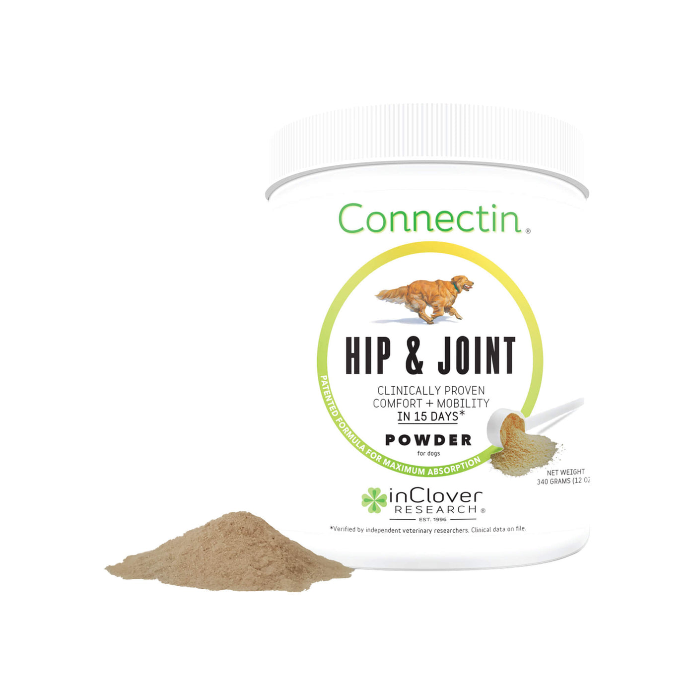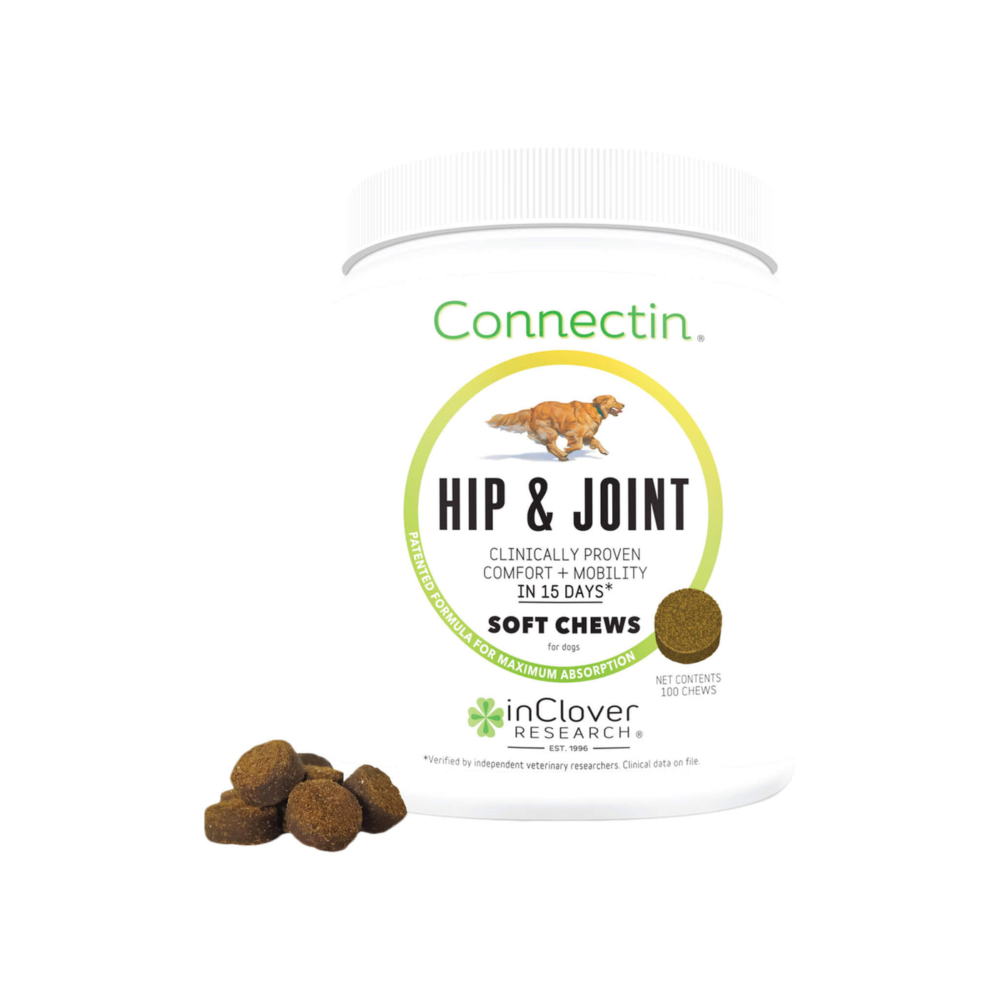 In Clover Connectin Hip and Joint Supplement for Dogs is a natural, herbal-based dog joint supplement. This hip and joint supplement for dogs is a patented formula that contains a unique blend of herbs and both of the body's own joint building blocks, in clinically tested levels. Connectin is the only clinically proven dog joint supplement.