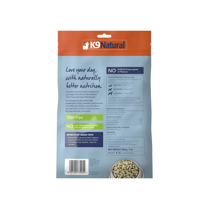 Sourced from grass-fed New Zealand lamb, this tripe topper provides a nutrient-dense, gut-friendly boost for dogs of all ages.Country of origin: New ZealandManufacturer: K9 Natural - Ingredients