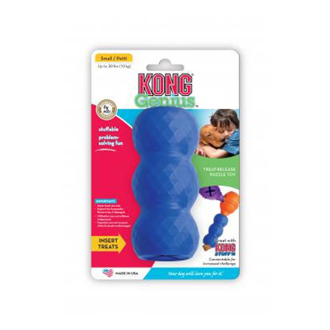 KONG Genius Dog Toys is a line of interactive treat dispensing toys. Genius toys can be interconnected to create new configurations for added challenge. Made in the USA of a durable, non-toxic, FDA food-approved TPR material, these toys are perfect for average chewers.