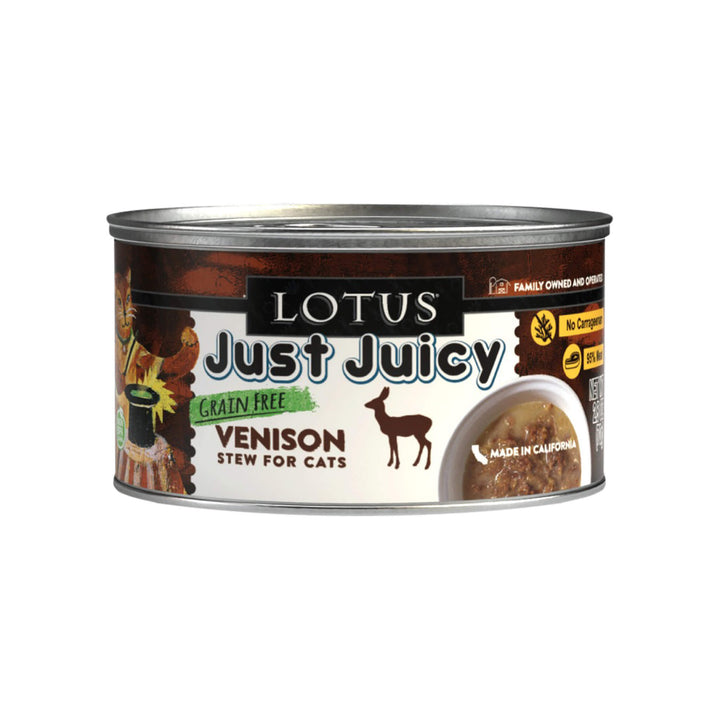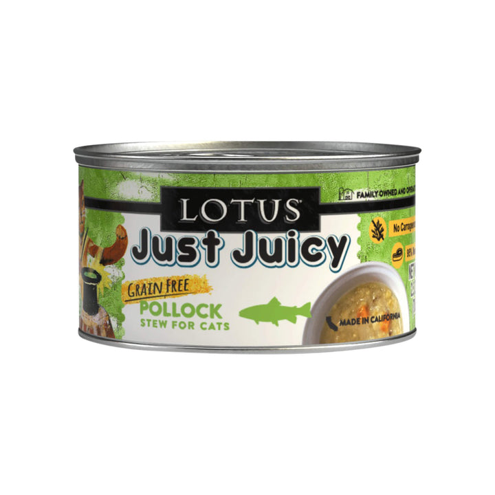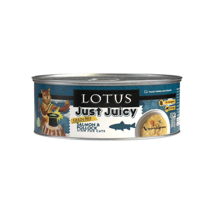 Lotus Just Juicy Stew for Cats is a grain-free wet cat food made with real shredded meat or poultry in a rich, moisture-filled broth. Gently kettle-cooked in small batches, it delivers soft texture and irresistible flavor for picky eaters and carnivorous cats alike.