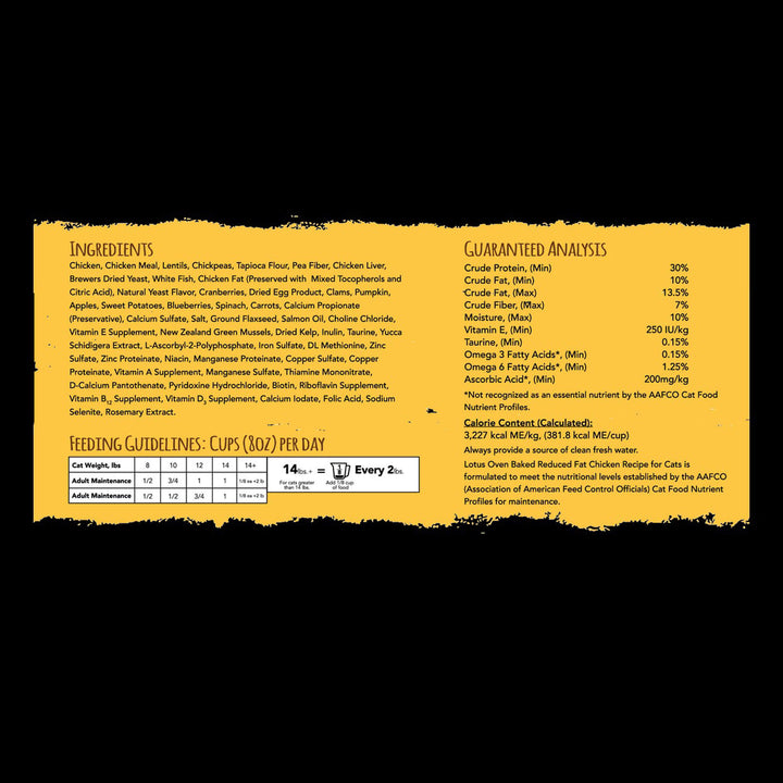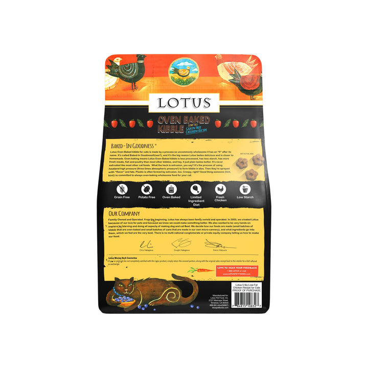 Made with real chicken and wholesome fruits and vegetables, Lotus Low Fat Dry Cat Food offers clean ingredients without artificial preservatives. This grain-free oven baked cat kibble supports healthy digestion and weight maintenance with balanced, slow-cooked nutrition.