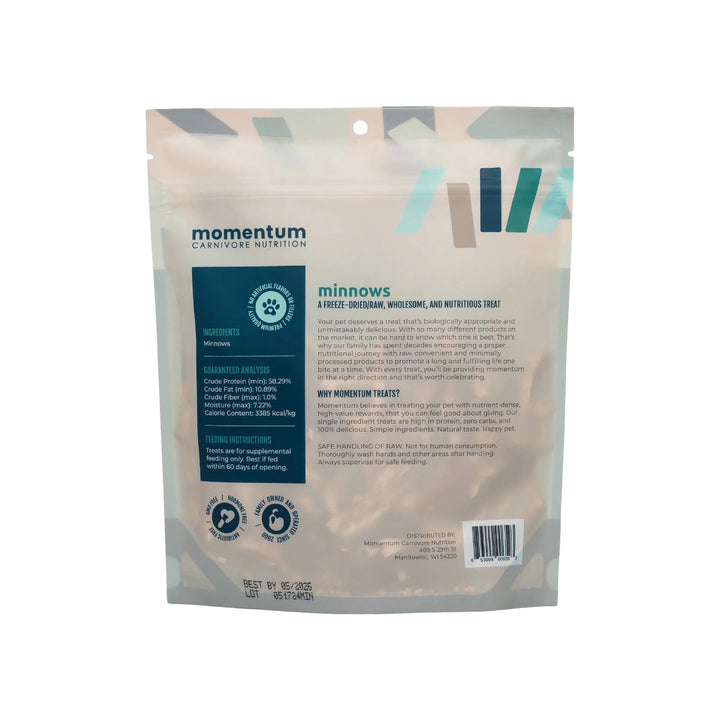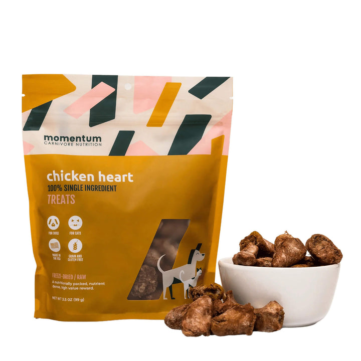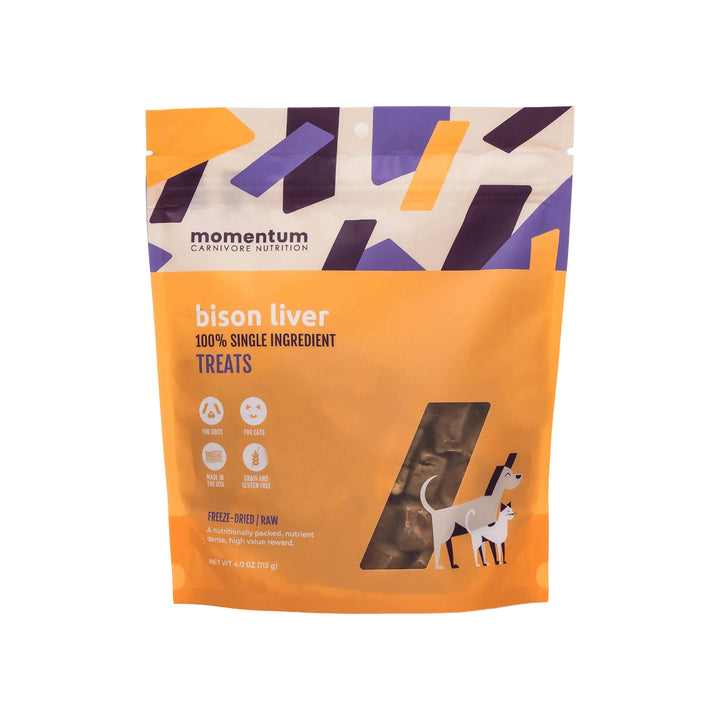 Momentum Treats for Dogs & Cats are made with 100% raw protein, gently freeze-dried to preserve nutrients and flavor. These single ingredient freeze-dried dog treats offer clean, species-appropriate nutrition with no grains, fillers, or additives—just one pure protein in every bite.