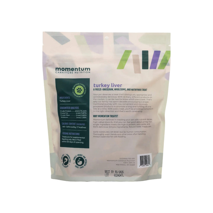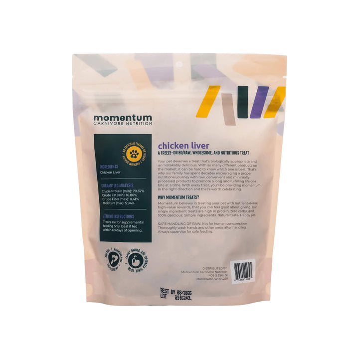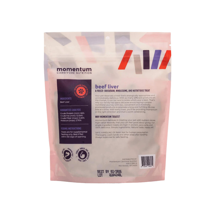 Rich in iron and high-value protein, beef liver offers a hearty reward dogs naturally crave. A bold, nutrient-dense option for training or treating.Country of origin: USAManufacturer: Momentum - Ingredients