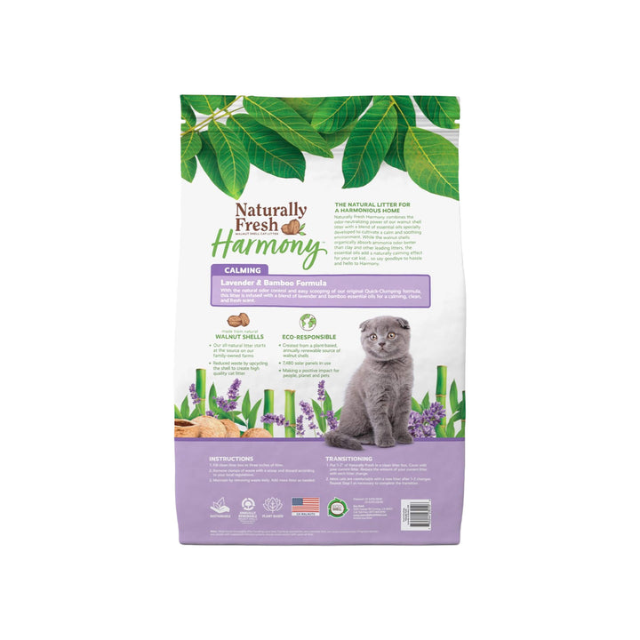 Naturally Fresh Harmony Calming Cat Litter blends the odor control power of walnut shells with a calming lavender and bamboo infusion. This walnut shell cat litter with essential oils offers fast clumping and low tracking while helping create a more peaceful litter box environment.