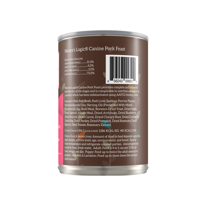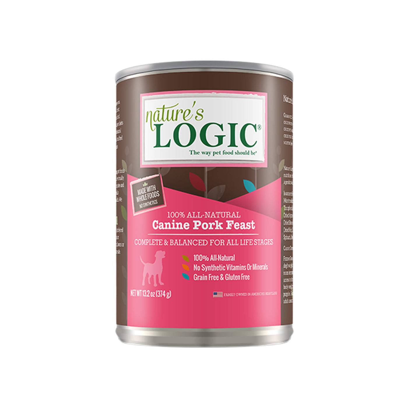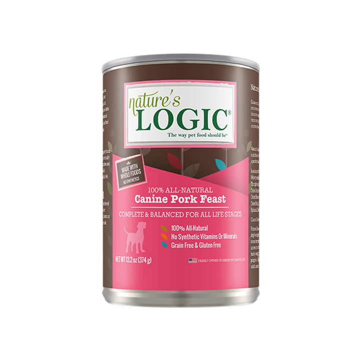 Nature's Logic Canine Pork Feast is a highly palatable and nutrient dense muscle meat and organ meat based canned food that uses whole ingredients and never includes synthetic ingredients.