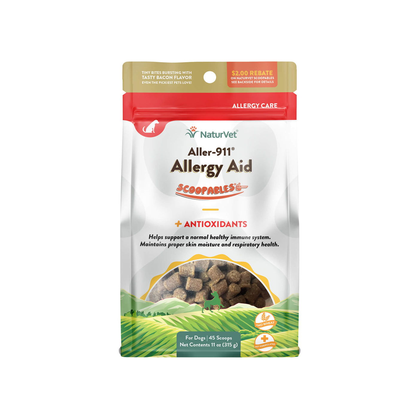 NaturVet Aller-911 Allergy Aid Soft Chews for Dogs provide gentle, effective relief from environmental allergies and skin irritation. These allergy chews for dogs are formulated with omega fatty acids, antioxidants, and vitamins to help maintain normal histamine levels and immune response.