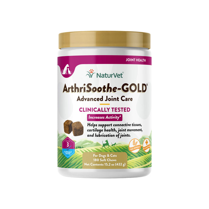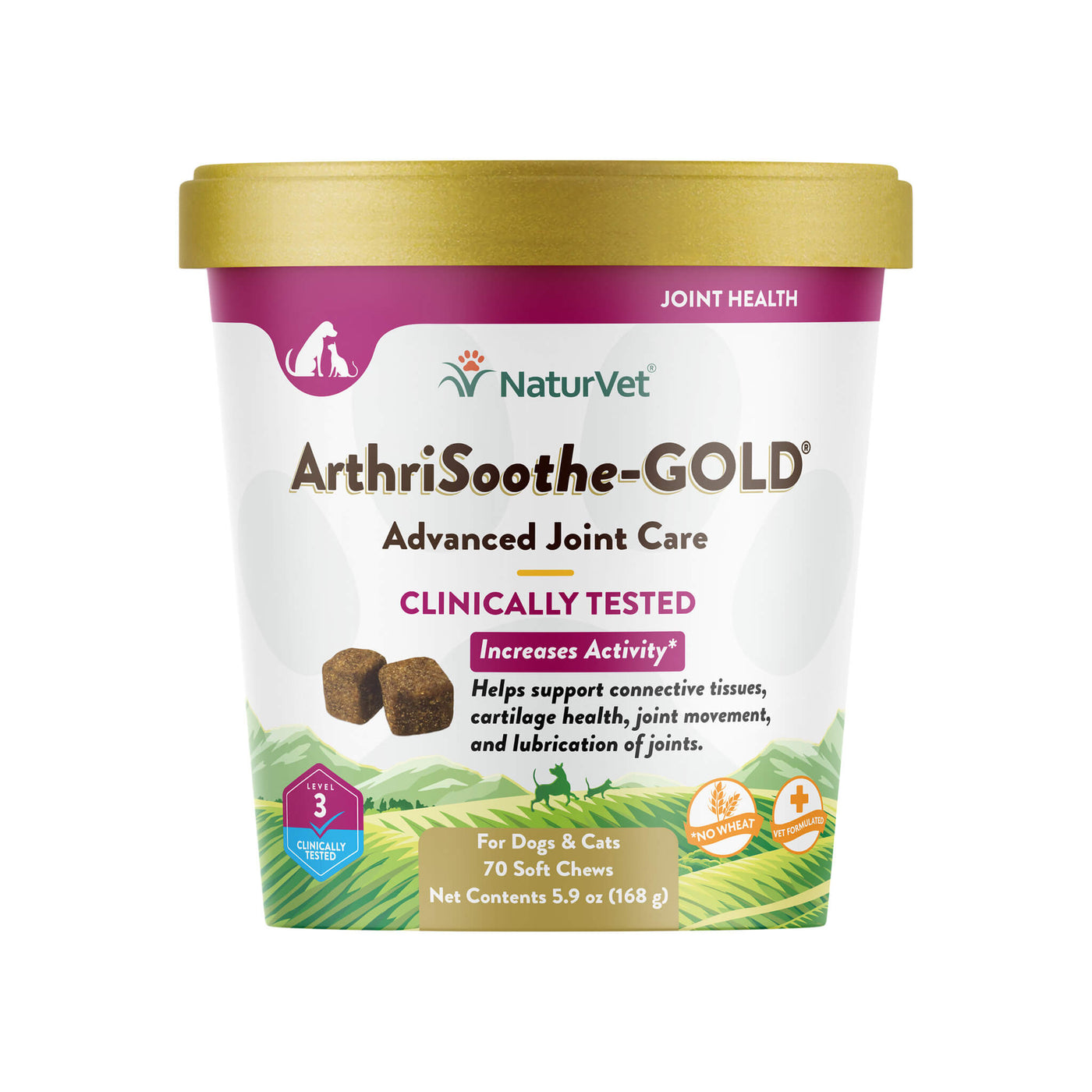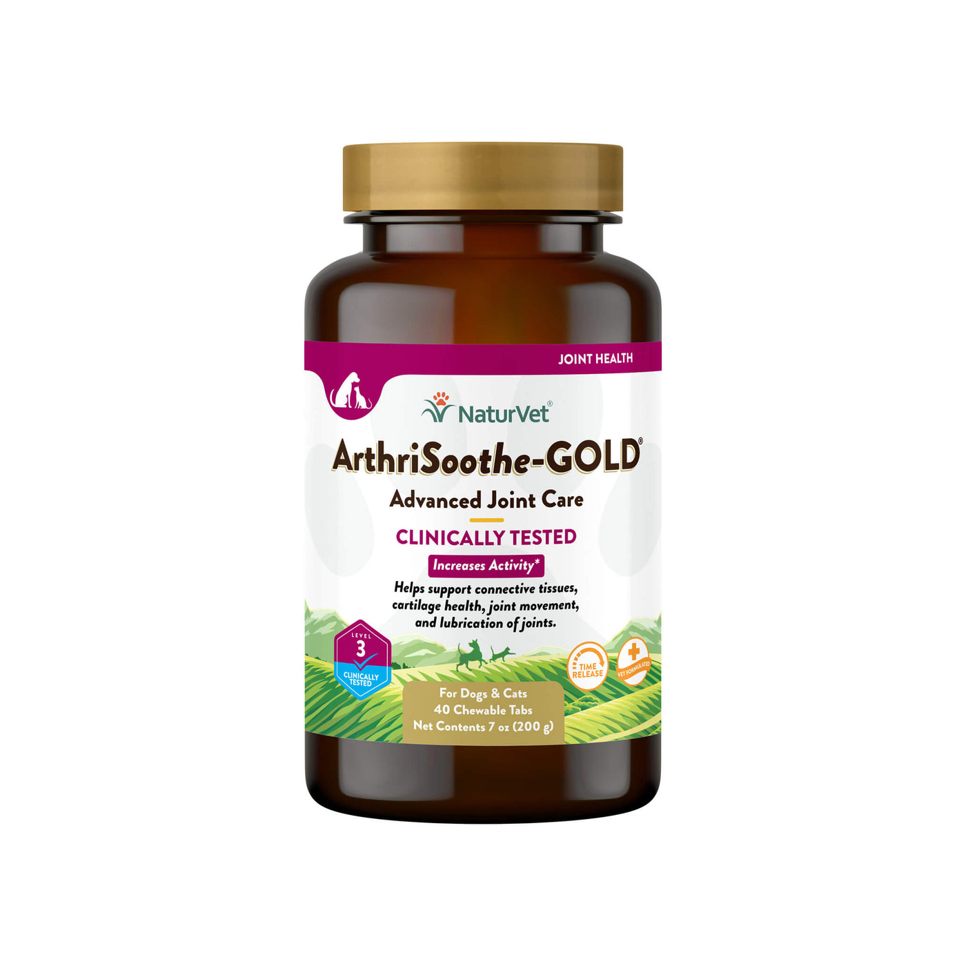 Formulated by veterinarians for daily use, NaturVet ArthriSoothe Gold for Dogs & Cats promotes long-term joint function and comfort. Each dose of these advanced joint care supplements for dogs and cats delivers powerful ingredients to keep pets active and moving with ease.