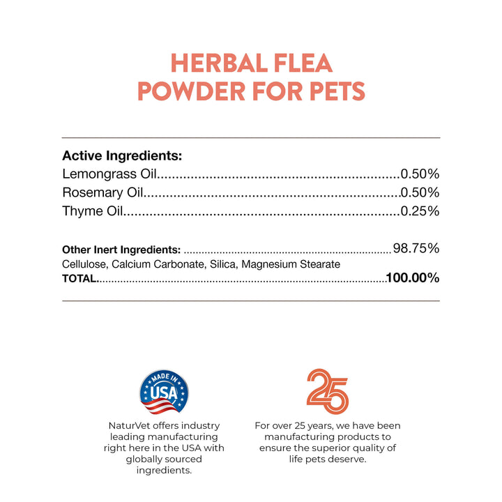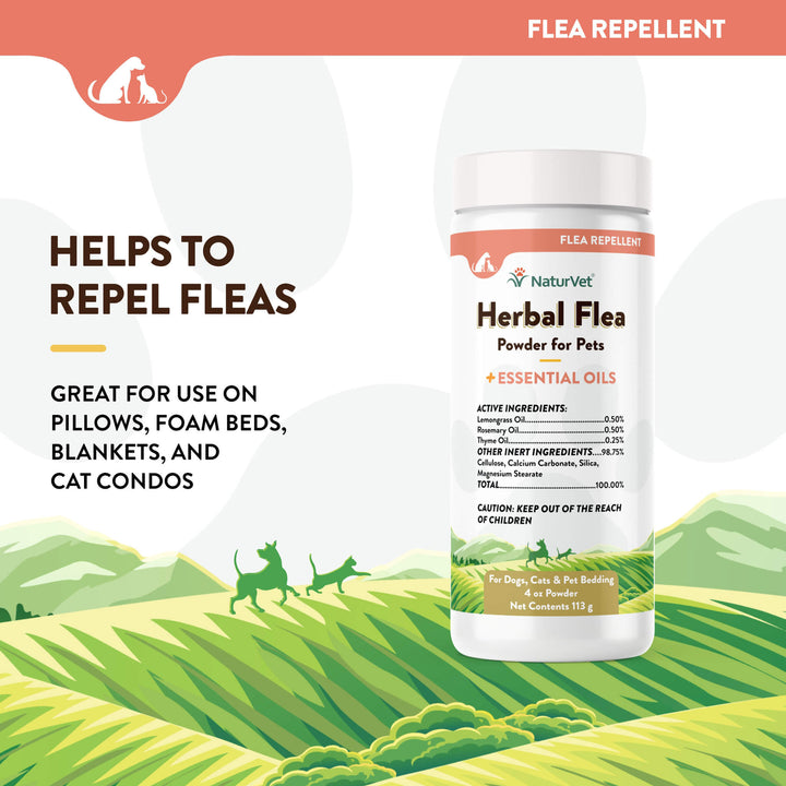 NaturVet Herbal Flea Repel Powder for Cats & Dogs is a multifunctional, all-natural flea repellent powder for cats, dogs, furniture and beds.