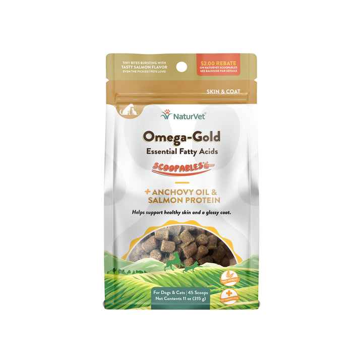 Formulated by veterinarians, NaturVet Omega-Gold for Dogs & Cats delivers omega-3 and omega-6 nutrients from high-quality salmon oil. Each serving of these omega fatty acids for dogs and cats nourishes the skin and coat while supporting immune and heart health.