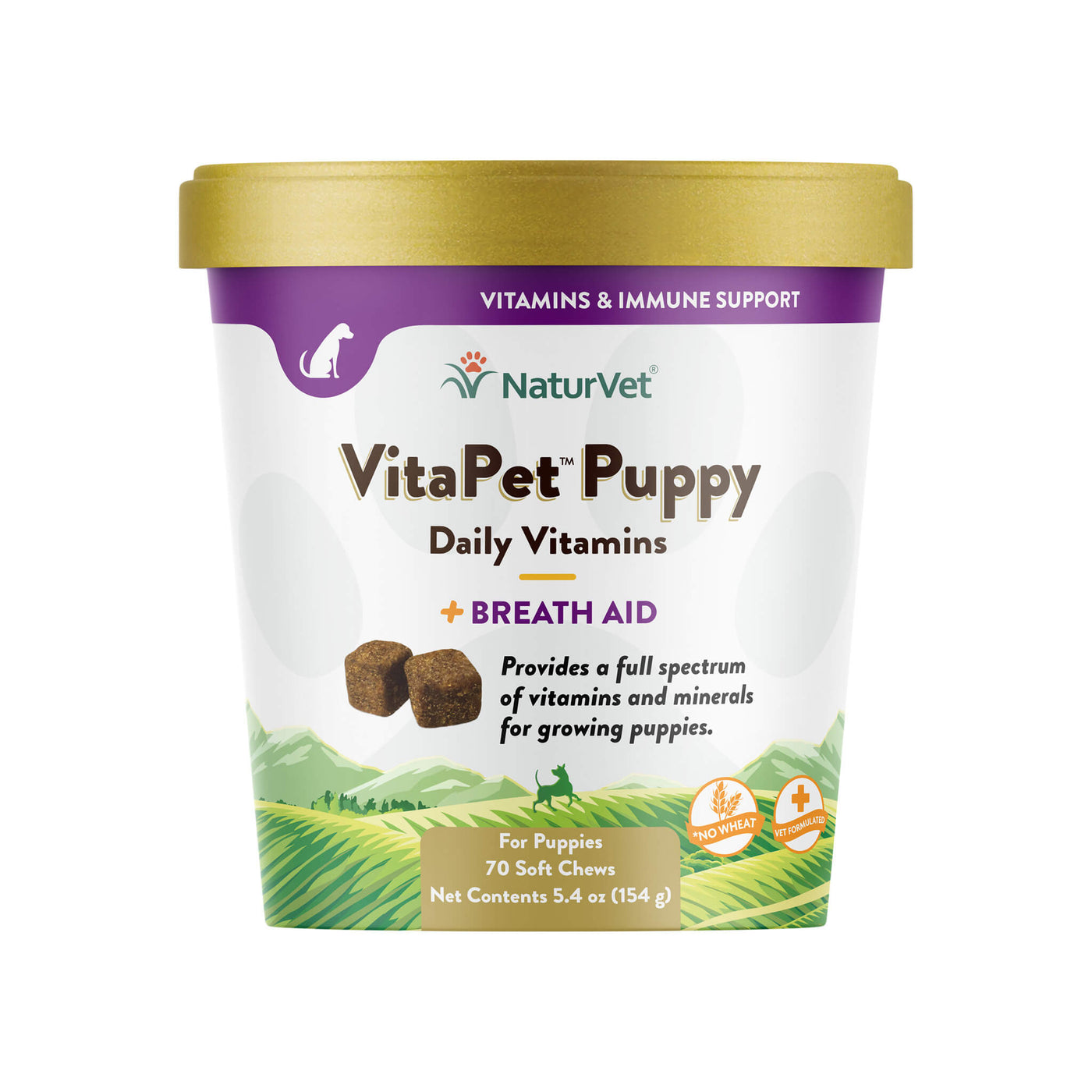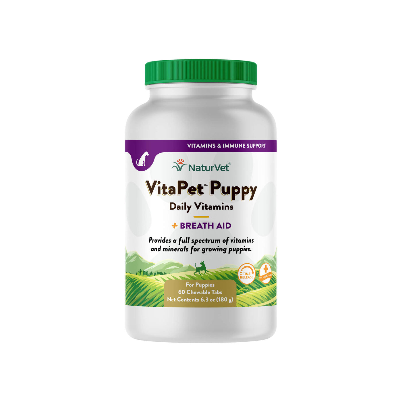 NaturVet VitaPet Daily Vitamins for Puppies provides complete nutritional support to help young dogs grow strong and healthy. This puppy multivitamin and breath aid includes essential vitamins, minerals, and nutrients plus parsley to naturally freshen breath while supporting development.