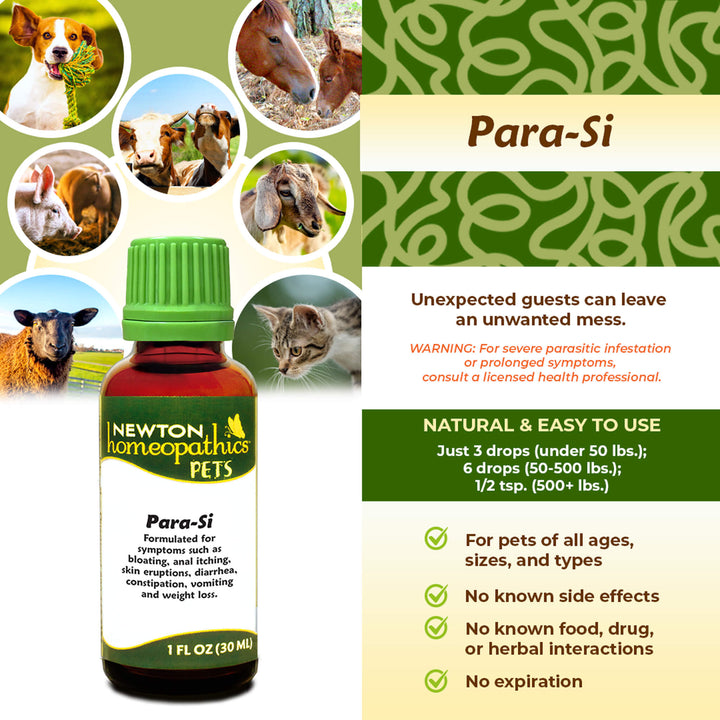 Newton Homeopathics Para-Si helps relieve symptoms of mild intestinal parasitic infestation such as bloating, colic, anal itching, diarrhea and weight loss. Homeopathic remedies are safe and easy to use. They focus on health and balance rather than symptom suppression.