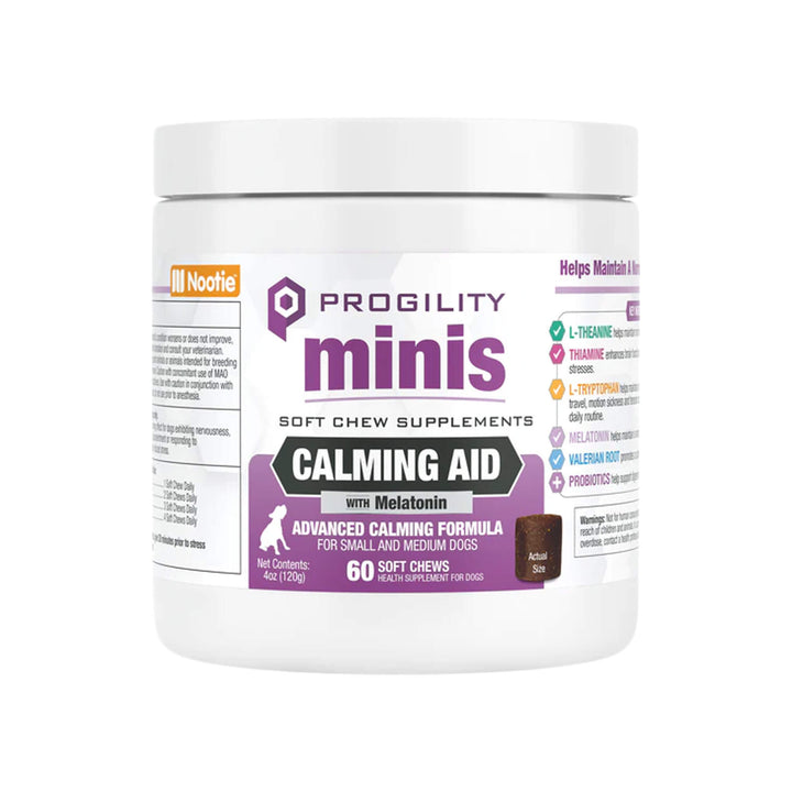 Nootie Progility Calming Supplement for Dogs is formulated to help manage stress, anxiety, and restlessness with a blend of gentle, non-sedating ingredients. This calming aid with melatonin for dogs includes L-theanine, chamomile, passion flower, and melatonin to support relaxation and balanced behavior.
