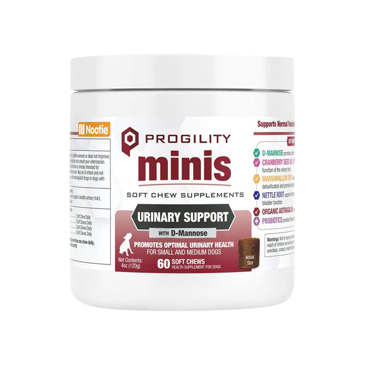 Nootie Progility Urinary Supplement for Dogs is formulated to help maintain a healthy urinary tract and support normal bladder function. This urinary support for dogs includes ingredients like cranberry, d-mannose, and marshmallow root to promote proper pH balance and comfort during urination.
