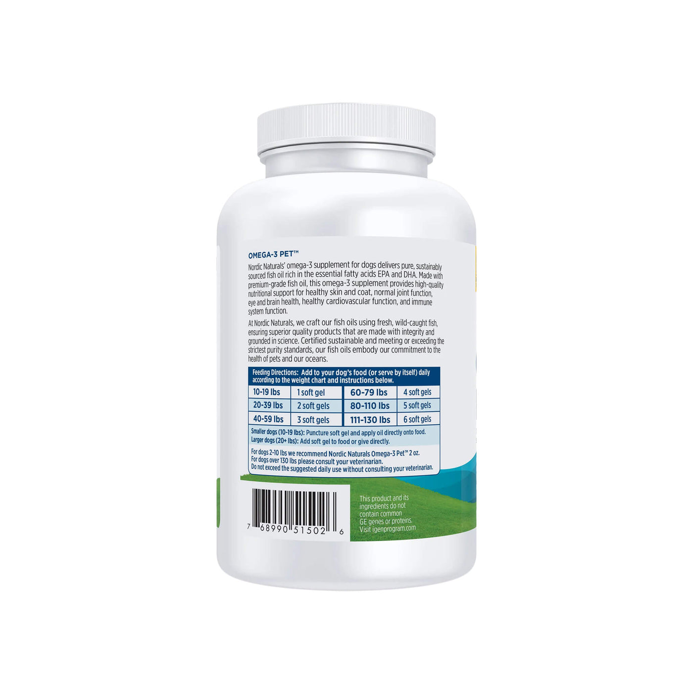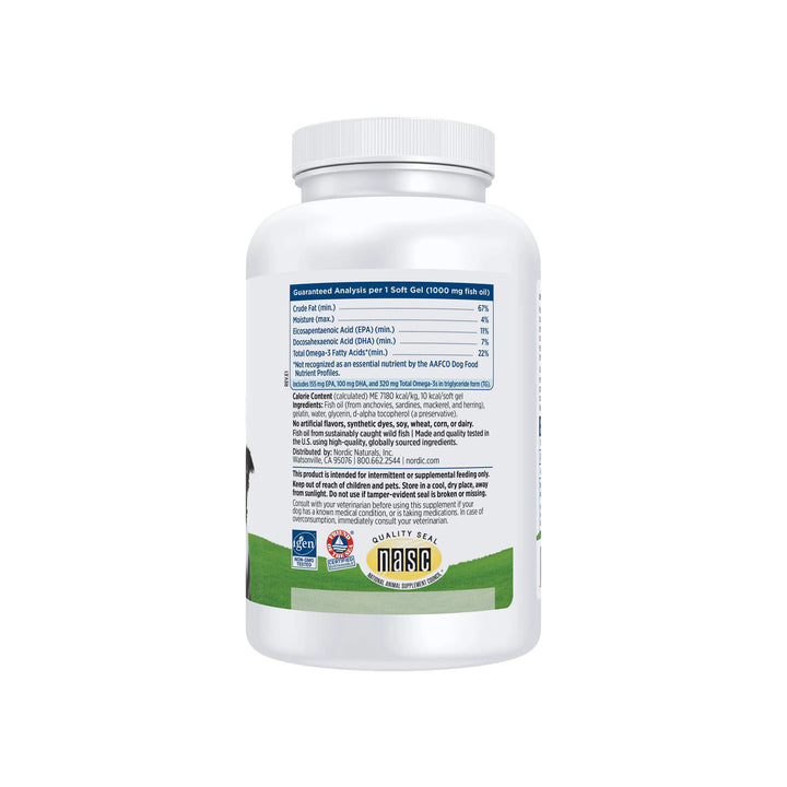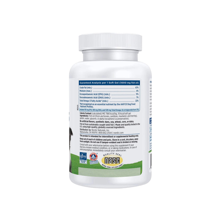 Nordic Naturals Omega-3 Soft Gel Fish Oil for Dogs contains an exclusive Omega-3 fatty acid formula derived from wild anchovies and sardines, offering convenient soft gels for ease of use and travel. The important Omega-3 fatty acids, EPA and DHA, support healthy skin and coat, joints, heart, eyes, brain, growth and reproduction in cats and dogs. Nordic Naturals provides the highest quality fish oils available, exceeding the international standards for purity and freshness.