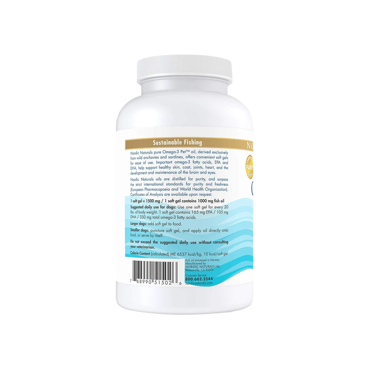 Nordic Naturals Omega-3 Soft Gel Fish Oil for Dogs contains an exclusive Omega-3 fatty acid formula derived from wild anchovies and sardines, offering convenient soft gels for ease of use and travel. The important Omega-3 fatty acids, EPA and DHA, support healthy skin and coat, joints, heart, eyes, brain, growth and reproduction in cats and dogs. Nordic Naturals provides the highest quality fish oils available, exceeding the international standards for purity and freshness.