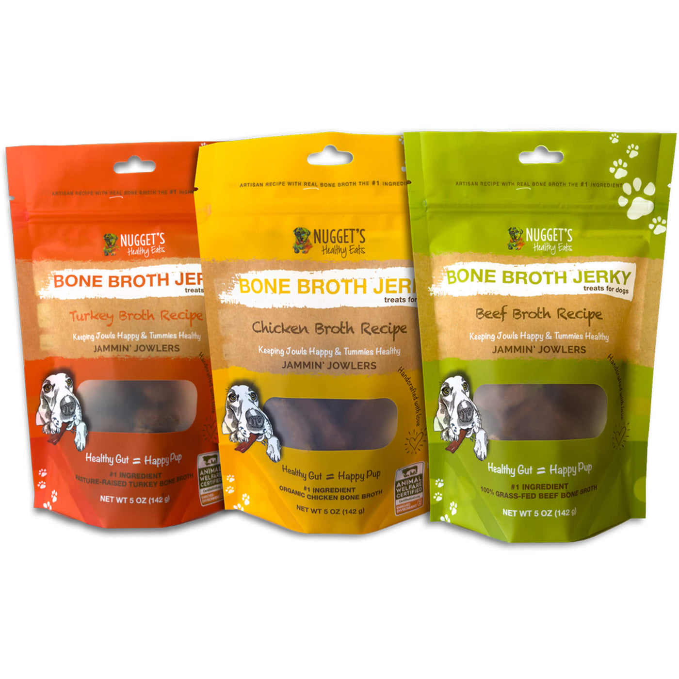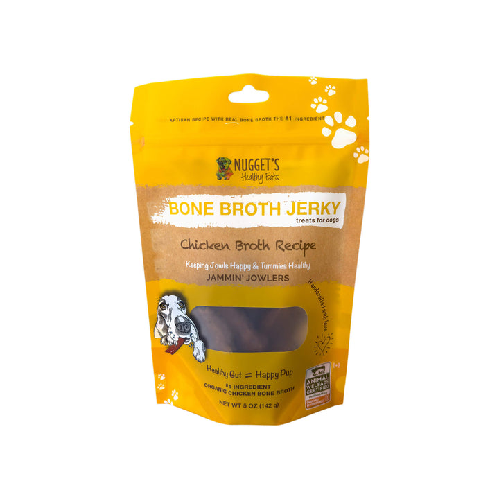 Nuggets Healthy Eats Jammin Jowlers Dog Treats blend the rich flavor of bone broth with the satisfying texture of jerky for a wholesome snack your pup will crave. These bone broth jerky treats for dogs are crafted from high-quality, humanely raised meats to provide nourishment and great taste.