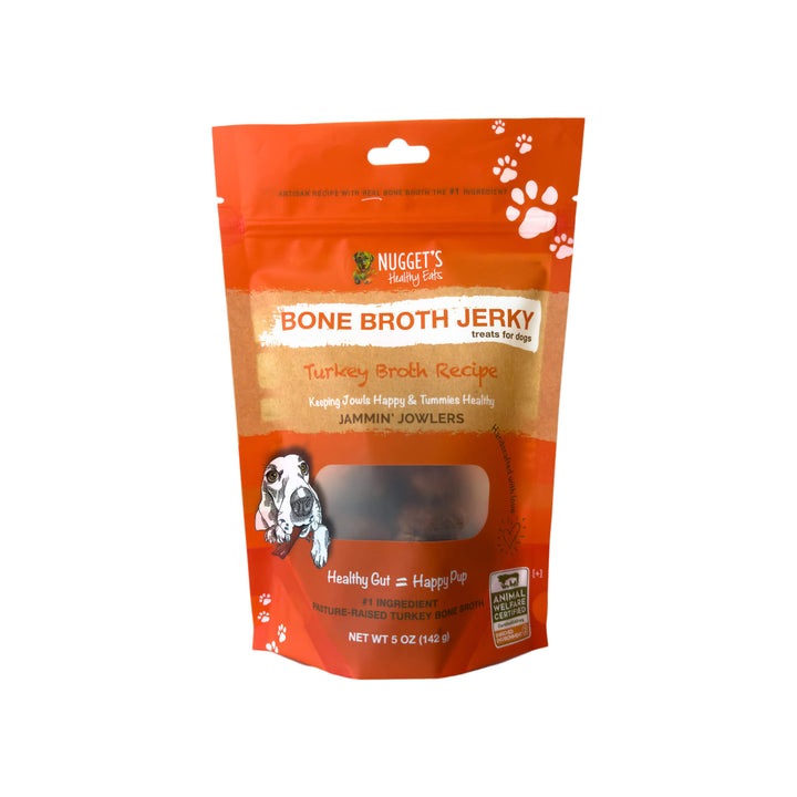 Reward your dog with Nuggets Healthy Eats Jammin Jowlers Dog Treats—bone broth jerky treats for dogs made with integrity and care.