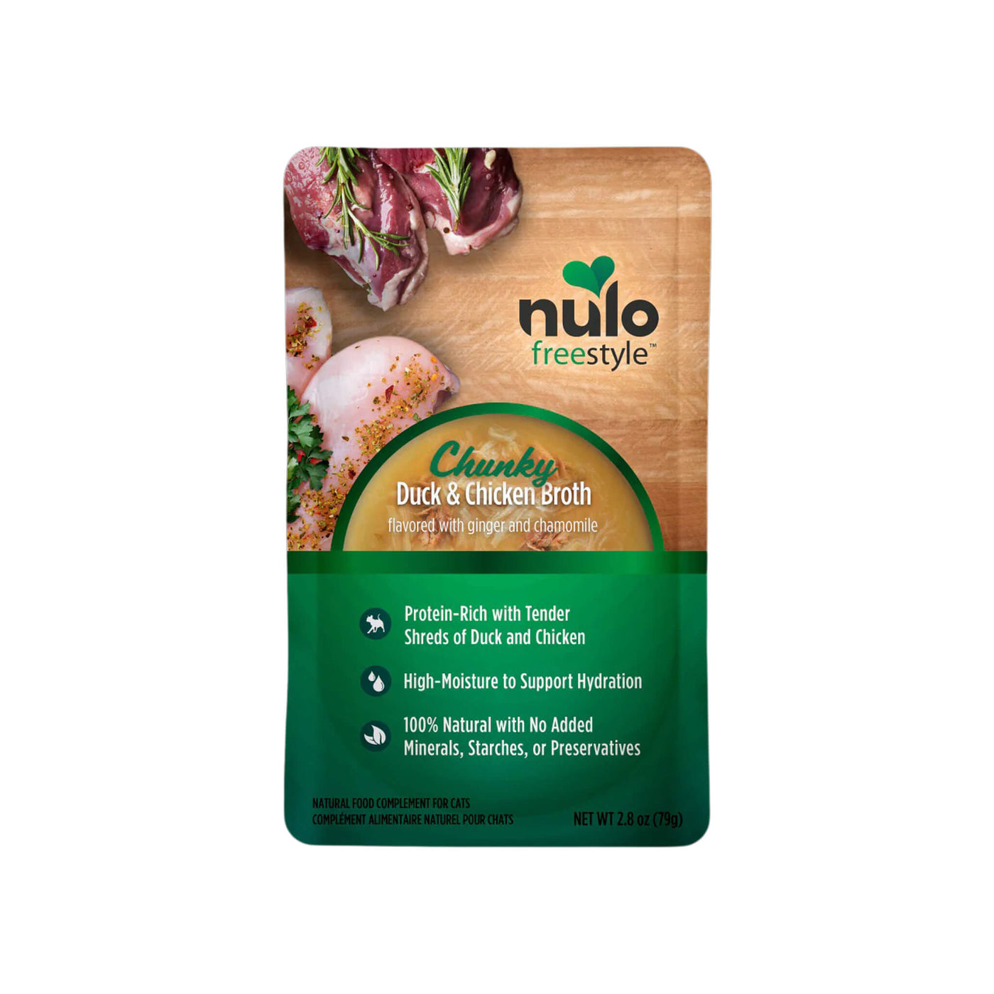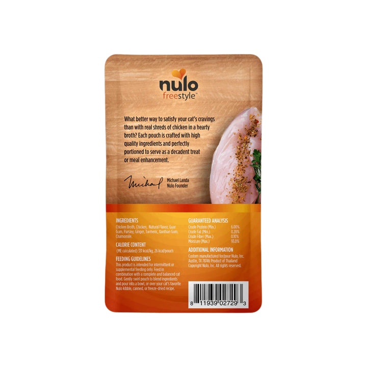 Crafted without added minerals, starches, or preservatives, this cat food topper features simple, wholesome ingredients like chicken, parsley, ginger, and chamomile. Nulo Freestyle Chunky Broths Wet Cat Food Topper is intended for intermittent or supplemental feeding and pairs perfectly with dry, canned, or freeze-dried recipes.
