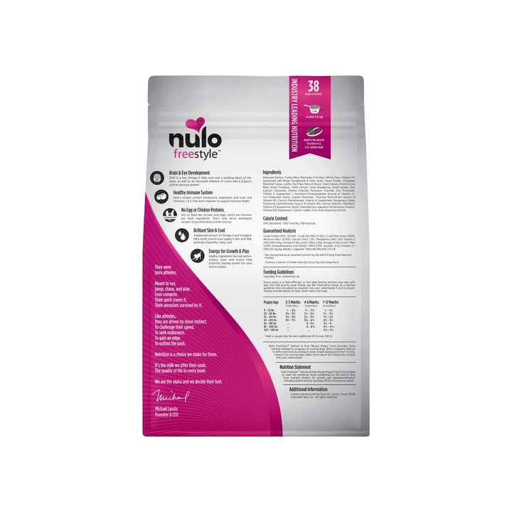 Formulated without grains, Nulo FreeStyle Grain-Free Puppy Food is rich in DHA from salmon oil for cognitive support, along with probiotics for digestive health. This high-protein puppy food delivers the nourishment young dogs need to thrive.
