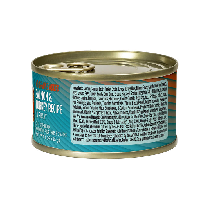 Minced morsels of wild-caught salmon and tender turkey deliver high-quality protein in a savory gravy, with added pumpkin and cranberries for digestive and antioxidant support.