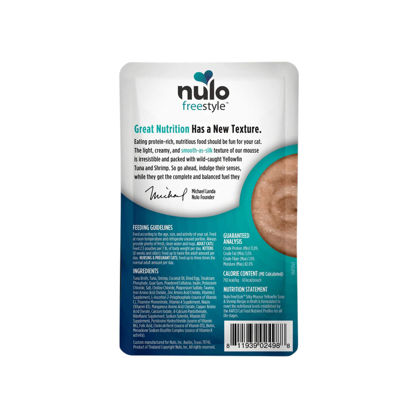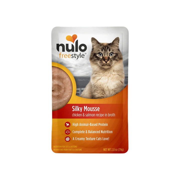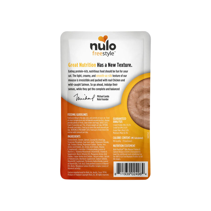 Savory chicken pairs with wild-caught salmon for a creamy, protein-rich mousse that blends land and sea flavors cats love.Country of origin: USAManufacturer: Nulo - Ingredients