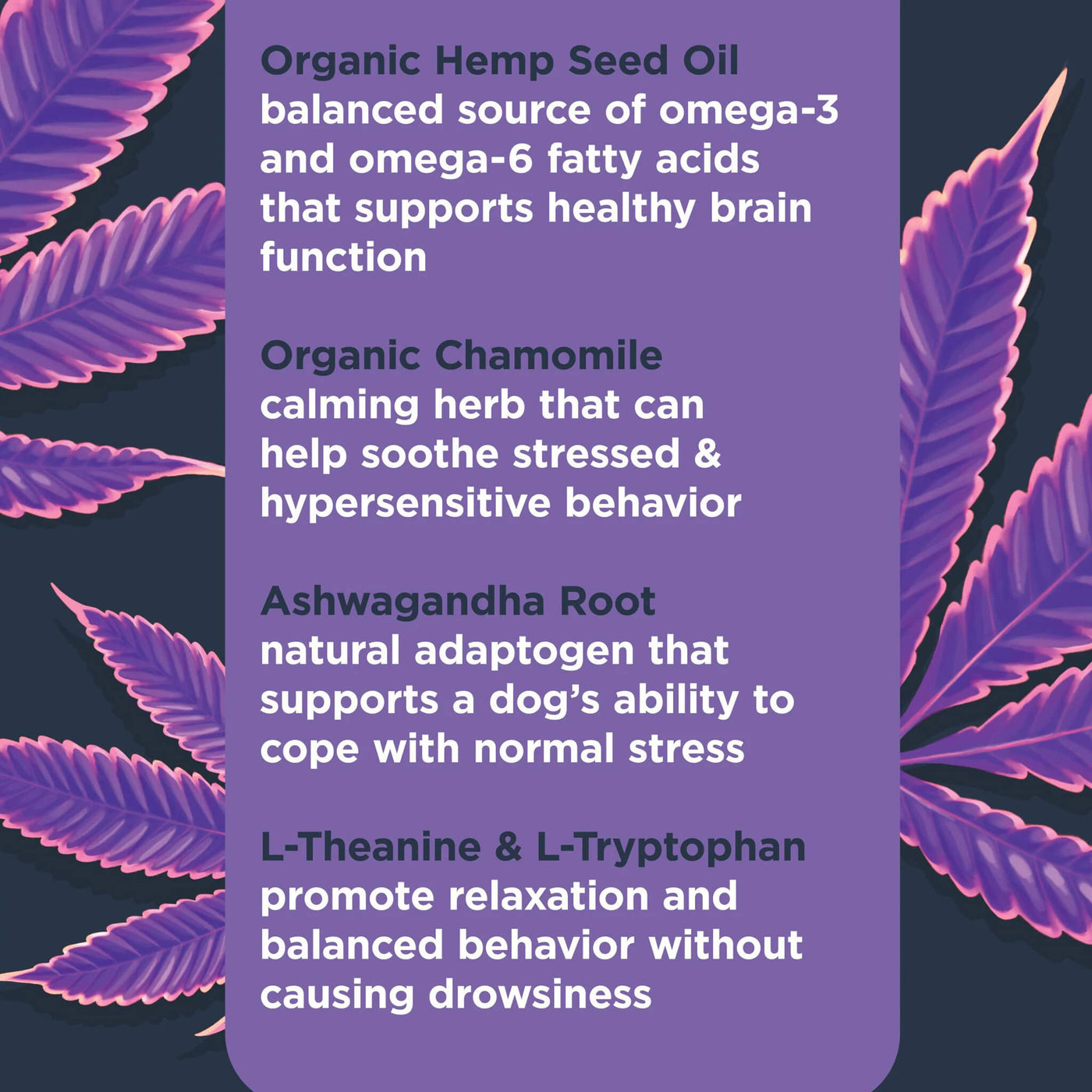 - Calming soft chews designed to help ease stress during daily routines.