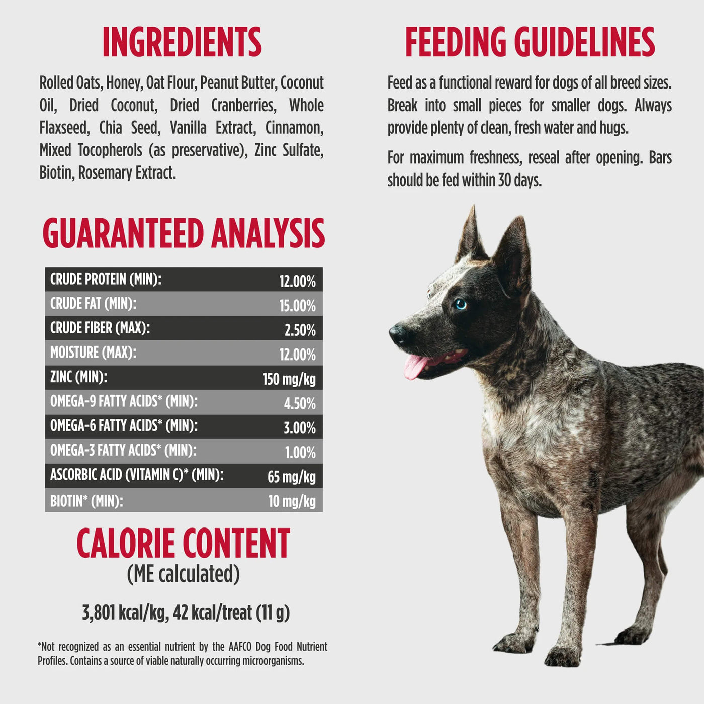 Rolled Oats, Honey, Oat Flour, Peanut Butter, Coconut Oil, Dried Coconut, Dried Cranberries, Whole Flaxseed, Chia Seed, Vanilla Extract, Cinnamon, Mixed Tocopherols (as preservative), Zinc Sulfate, Biotin, Rosemary Extract.
