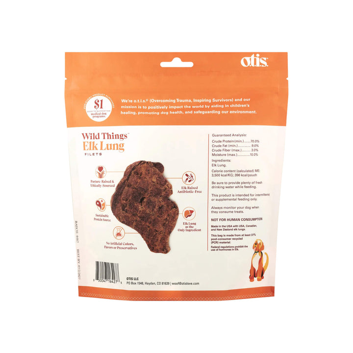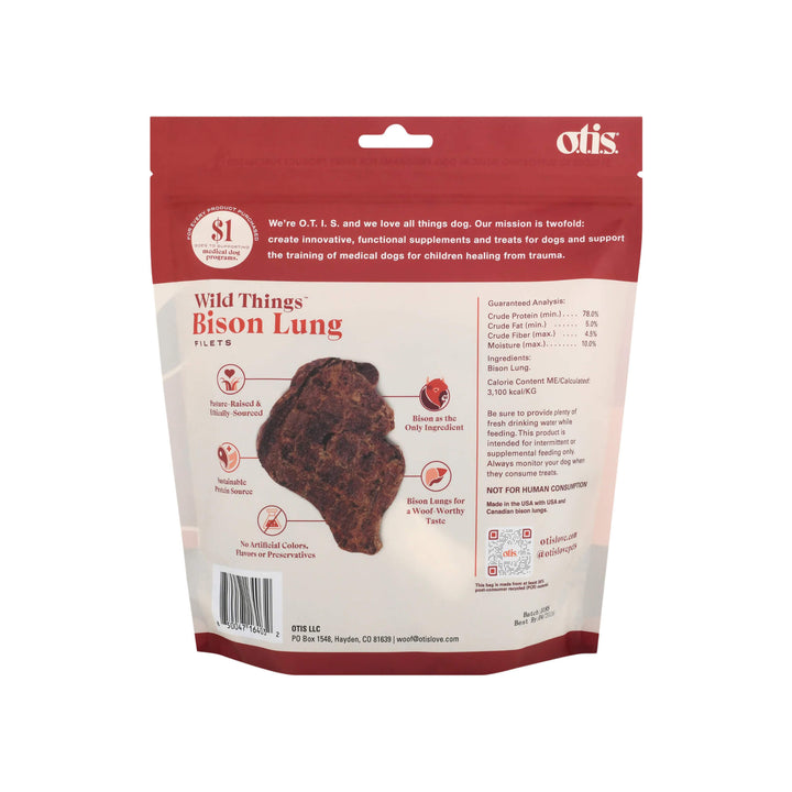 O.T.I.S. Wild Things Lung Filets for Dogs are wholesome, air dried single ingredient dog treats made from naturally sourced lung. Each piece is carefully prepared to lock in flavor and nutrients, offering a clean, protein-rich reward your dog will love.