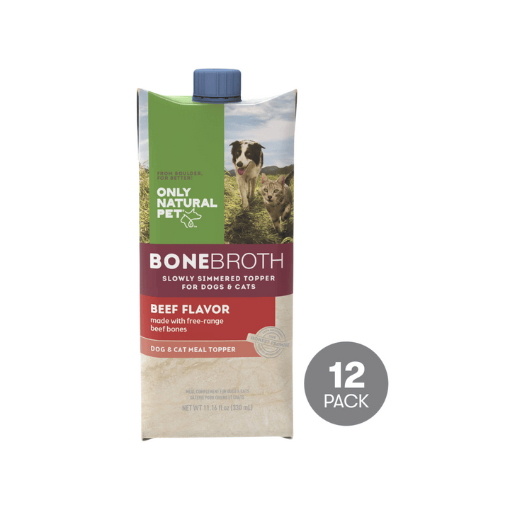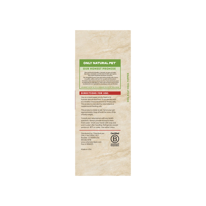Only Natural Pet Beef Bone Broth for Dogs and Cats Meal Topper can be used as a meal topper on dry food or to hydrate dehydrated and freeze-dried food. It can also be used as a healthy treat enticement for finicky pets, or frozen in an ice cube tray for a tasty pet popsicle. Ready to use, this beef bone broth for dogs and cats is intended for intermittent or supplemental feeding.