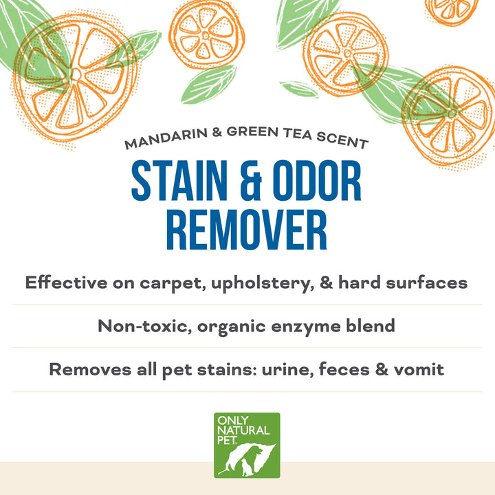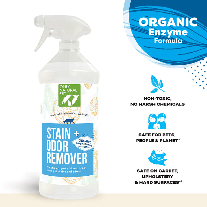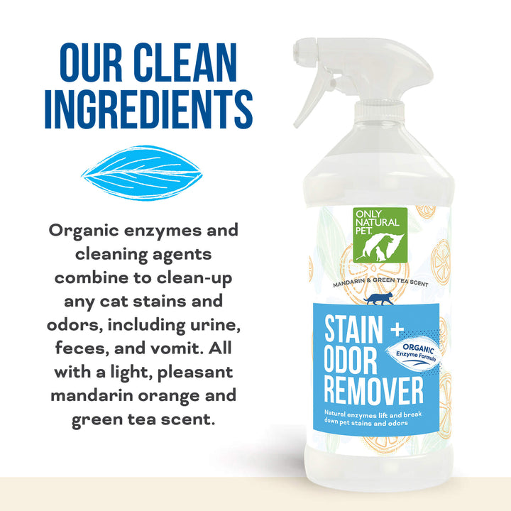 Featuring a light scent of mandarin orange and green tea, Only Natural Pet Cat Stain & Odor Remover comes in an easy to use spray bottle and is non-toxic, with no harsh chemicals or odors, and safe for pets and people. Whether used on existing or new stains and odors, the enzymes won't stop working until the offender is eliminated, making it ideal for furniture, kennels, cars and so much more.