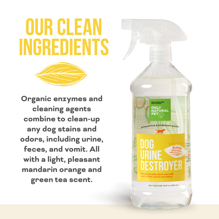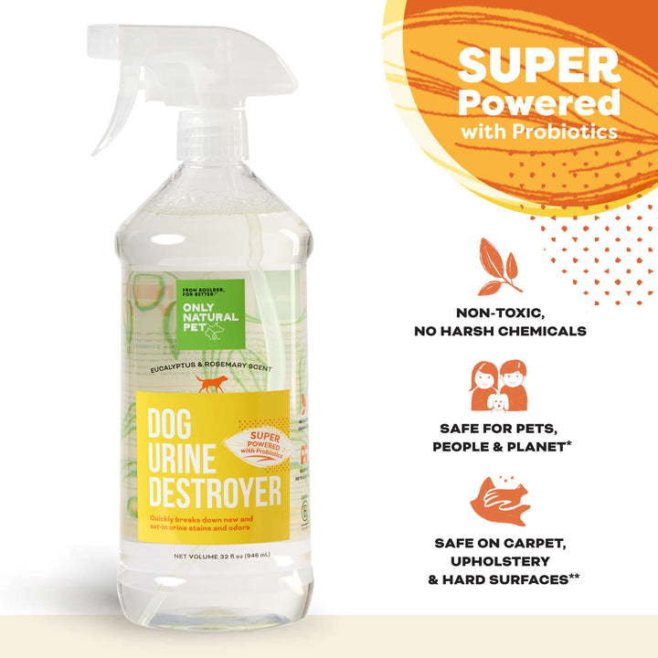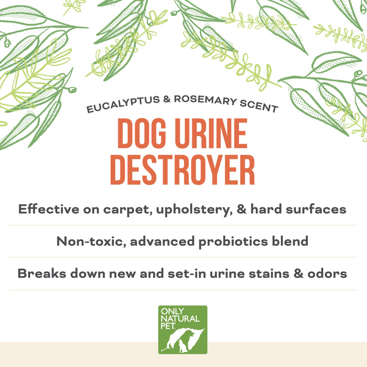 Completely break down new and set-in dog urine stains and odors with the super power of probiotics. Extra tough on stains and odors, this dog urine eliminator works at a molecular level, breaking down urine and leaving your soiled surfaces clean and odor free. Completely non-toxic and with no harsh chemicals, this formula can be use on carpet, upholstery and hard surfaces (do not use on silk or leather), and is safe for pets, people, and planet. Only Natural Pet Dog Urine Stain & Odor Destroyer features a pleasant eucalyptus and rosemary essential oil scent while the dog urine odor eliminator gets to work.