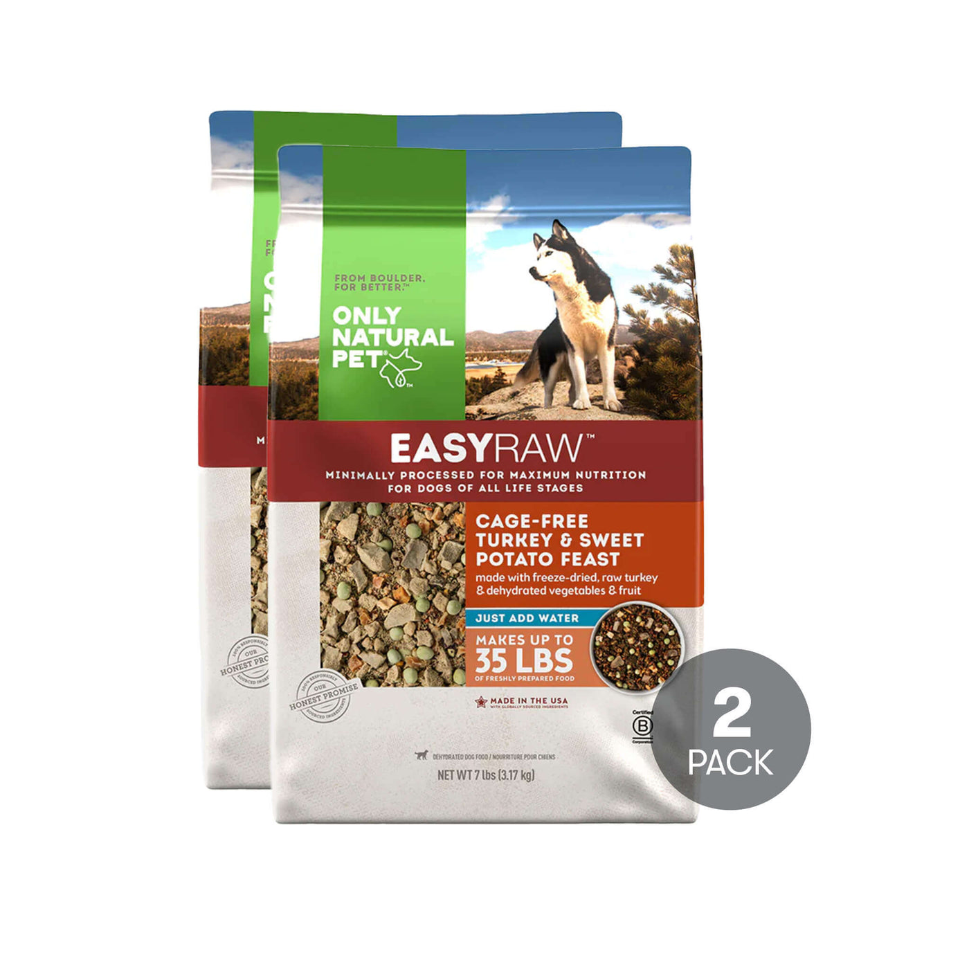 Only Natural Pet EasyRaw Cage-Free Turkey & Sweet Potato Feast Dehydrated Dog Food is made with freeze-dried, raw turkey and dehydrated vegetables and fruits. These minimally processed ingredients combine for maximum nutrition, freshly prepared meal that is complete and balanced for adult dogs.