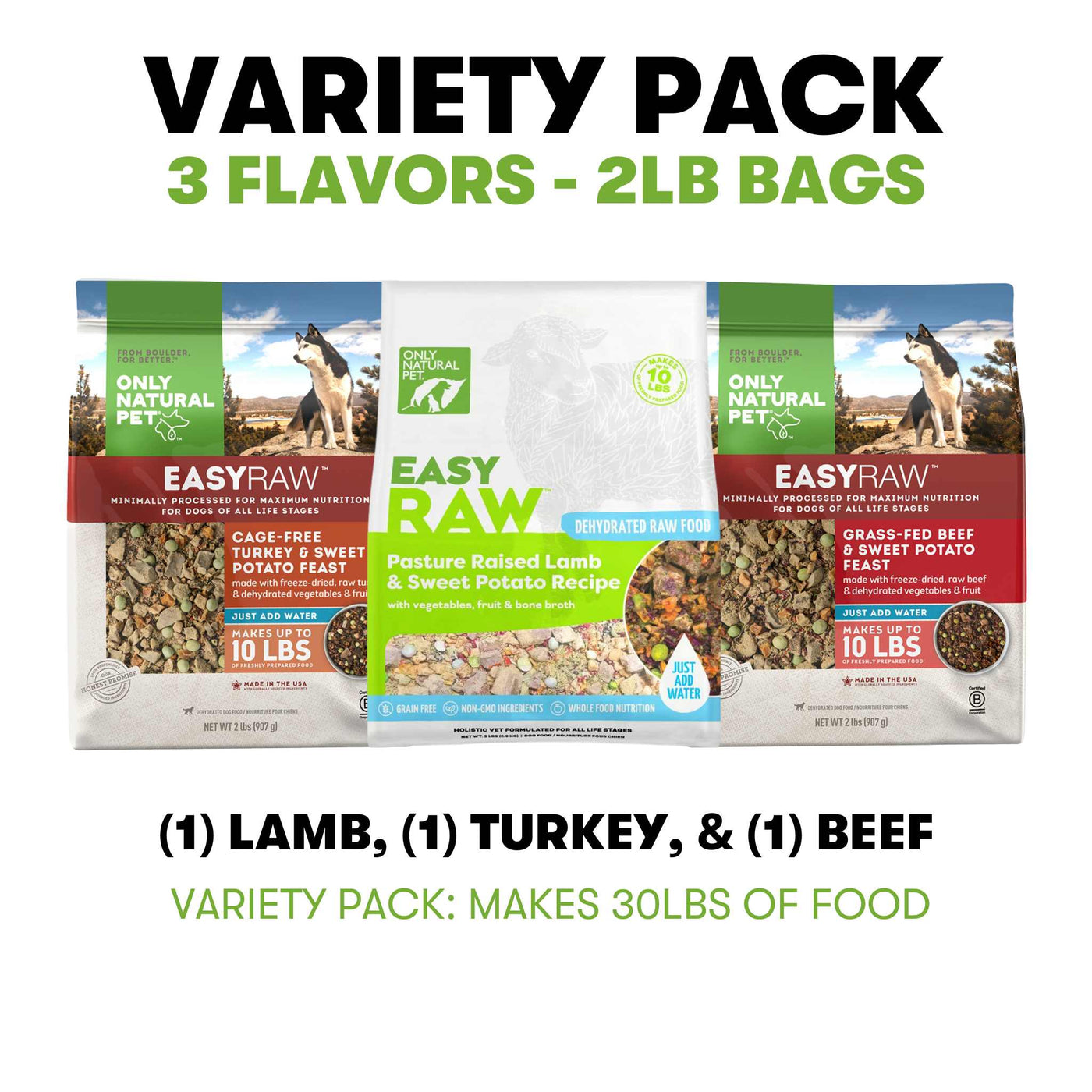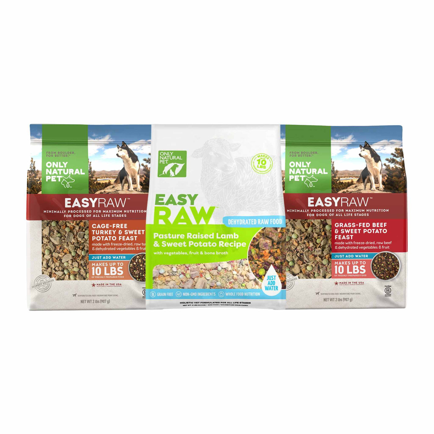 Only Natural Pet EasyRaw Cage-Free Turkey & Sweet Potato Feast Dehydrated Dog Food is made with freeze-dried, raw turkey and dehydrated vegetables and fruits. These minimally processed ingredients combine for maximum nutrition, freshly prepared meal that is complete and balanced for adult dogs.