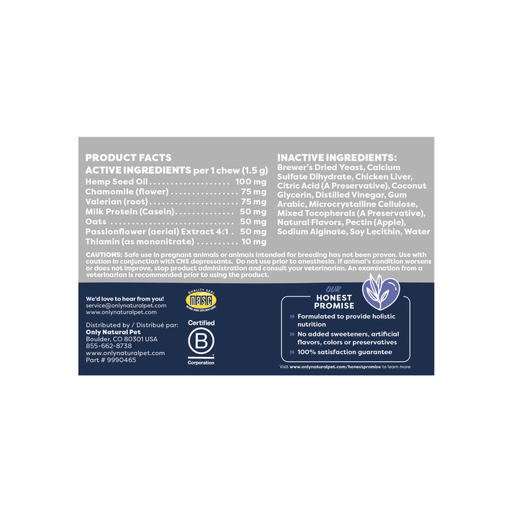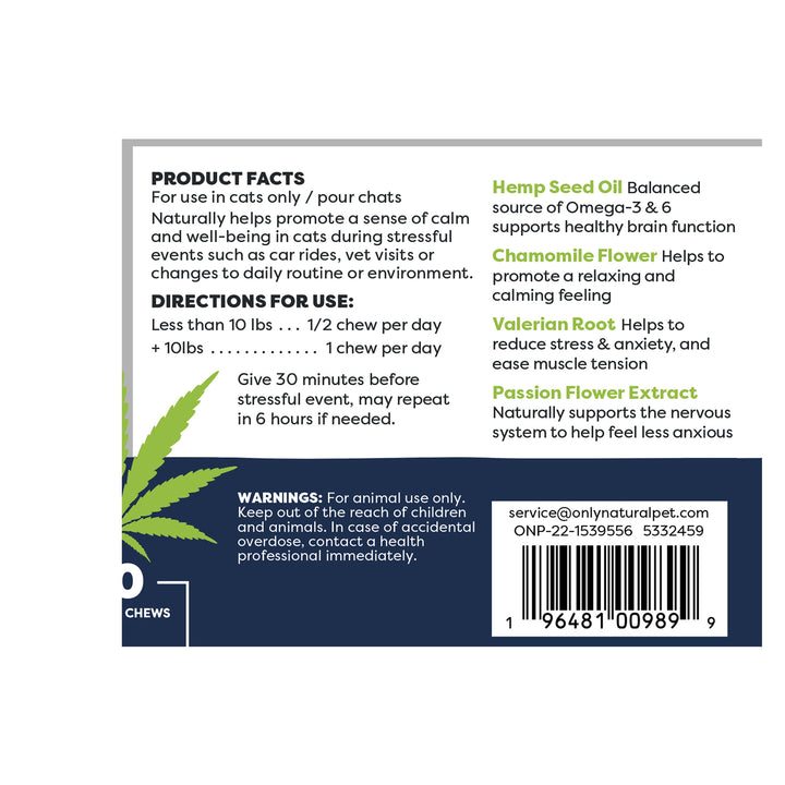 Only Natural Pet Hemp Calming Supplement soft chews for cats naturally help cats cope with external stresses such as car rides, vet visits or changes to daily routine or environment. They feature a holistic combination of hemp seed oil, chamomile, valerian and passion flower.