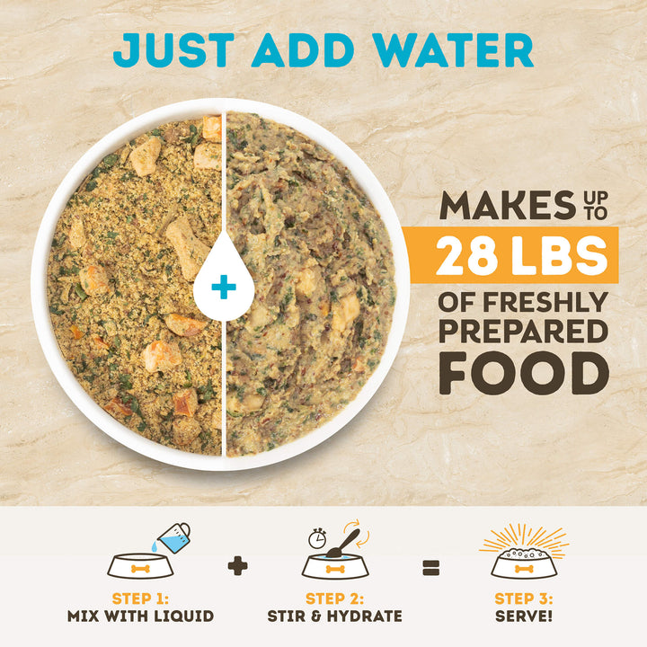 No stress, no mess! Just add water, wait, and serve your dog a fresh, highly nutritious meal.