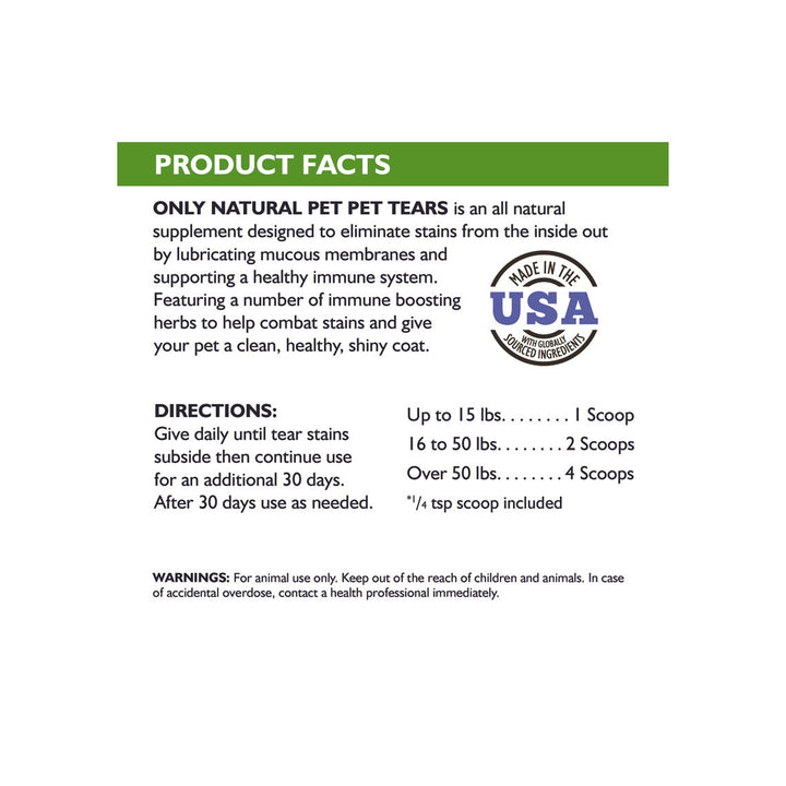 Only Natural Pet Tear Stains Antioxidant & Immune Support is veterinarian formulated with natural ingredients to help eliminate unsightly tear stains for beautiful, healthy eyes. For use in dogs and cats over the age of six weeks.